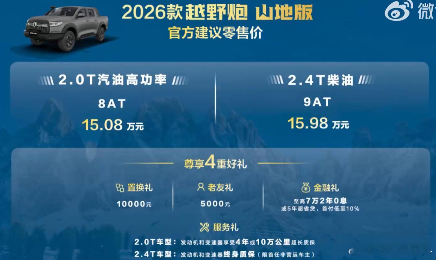 长城炮 山地版正式上市,全系6款配置,售价12.38-14.08万元,并且提供四重权益新版本提供18吋AT胎和3mm金属底盘护板,涉水深度可达700mm;为了确保山路驾驶灵活性,山地版只能选择标轴标厢,轴距3230mm其中商用炮山地版还提供右前盲区监测(MT)/全景影像(AT)和前雾灯,越野炮山地版则提供涉水喉、金属侧踏、前后铁杠,后悬可选多连杆螺簧or板簧动力方面,商用炮山地版提供2.4T柴油+9AT/6MT、2.0T柴油+8AT/6MT可选,最大功率135kW、120kW,峰值扭矩480N·m、400N·m,可选装博格华纳4A+MLOCK超级四驱越野炮山地版提供2.0T高功+8AT、2.4T柴油+9AT可选,最大功率185kW、135kW,峰值扭矩385N·m、400N·m,标配博格华纳4A+MLOCK超级四驱SUV大百科 大v聊车
