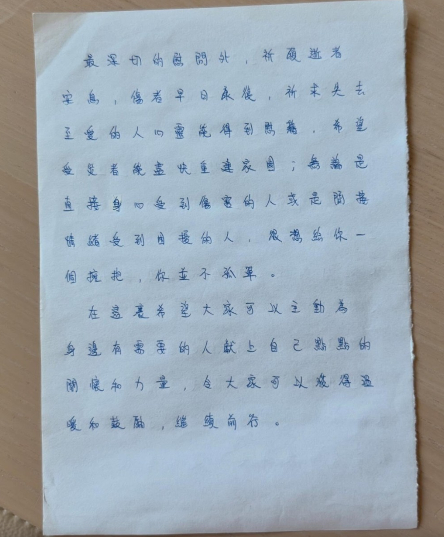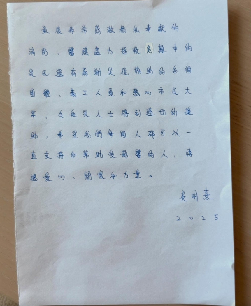 大埔宏福苑五级火 炎明熹三页亲笔信抒发感受 呼吁主动关怀身边人炎明熹在信中表示,回想事故发生,形容这是 “无数家庭正在经历前所未有的伤痛与苦难,身体与心灵上所承受的,都非笔墨所能形容;想到那些被瞬间吞噬的家园,想到被迫与亲人分离的家庭,那份心碎与无力的悲戚……” 炎明熹更将事故的发生比作 “生活的地方崩塌了好大一片,再也无法弥补”。她在信中向宏福苑灾民送上慰问,呼吁大家主动为身边人送上关怀与力量,继续前行:“无论是直接在身心上受到伤害的人,还是间接在情绪上受到困扰的人,我很想给你一个拥抱,你并不孤单。” 炎明熹还特别感谢无私奉献的消防人员、医护人员、义工以及热心市民,希望大家能继续帮助受影响的人,为他们送上关怀与力量。