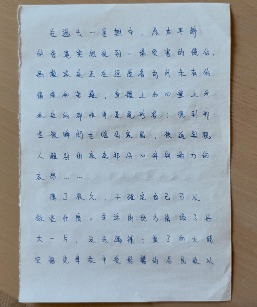 大埔宏福苑五级火炎明熹三页亲笔信抒发感受呼吁主动关怀身边人炎明熹在信中表示,