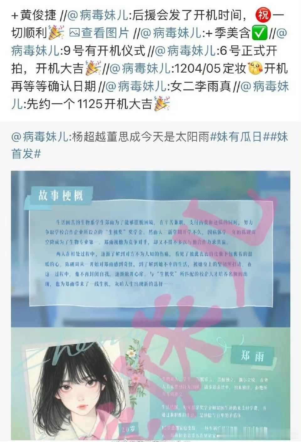 杨超越、董思成的《今天是太阳雨》6号开拍,9号举办非公开开机仪式,网传男二是黄俊捷。