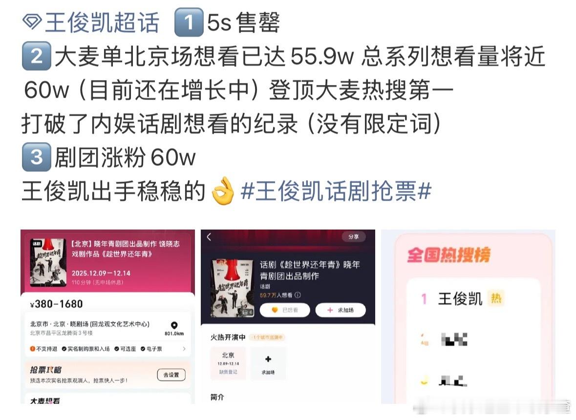 王俊凯主演话剧《趁世界还年青》今日开票,5秒内6场共4848张票全部售罄!