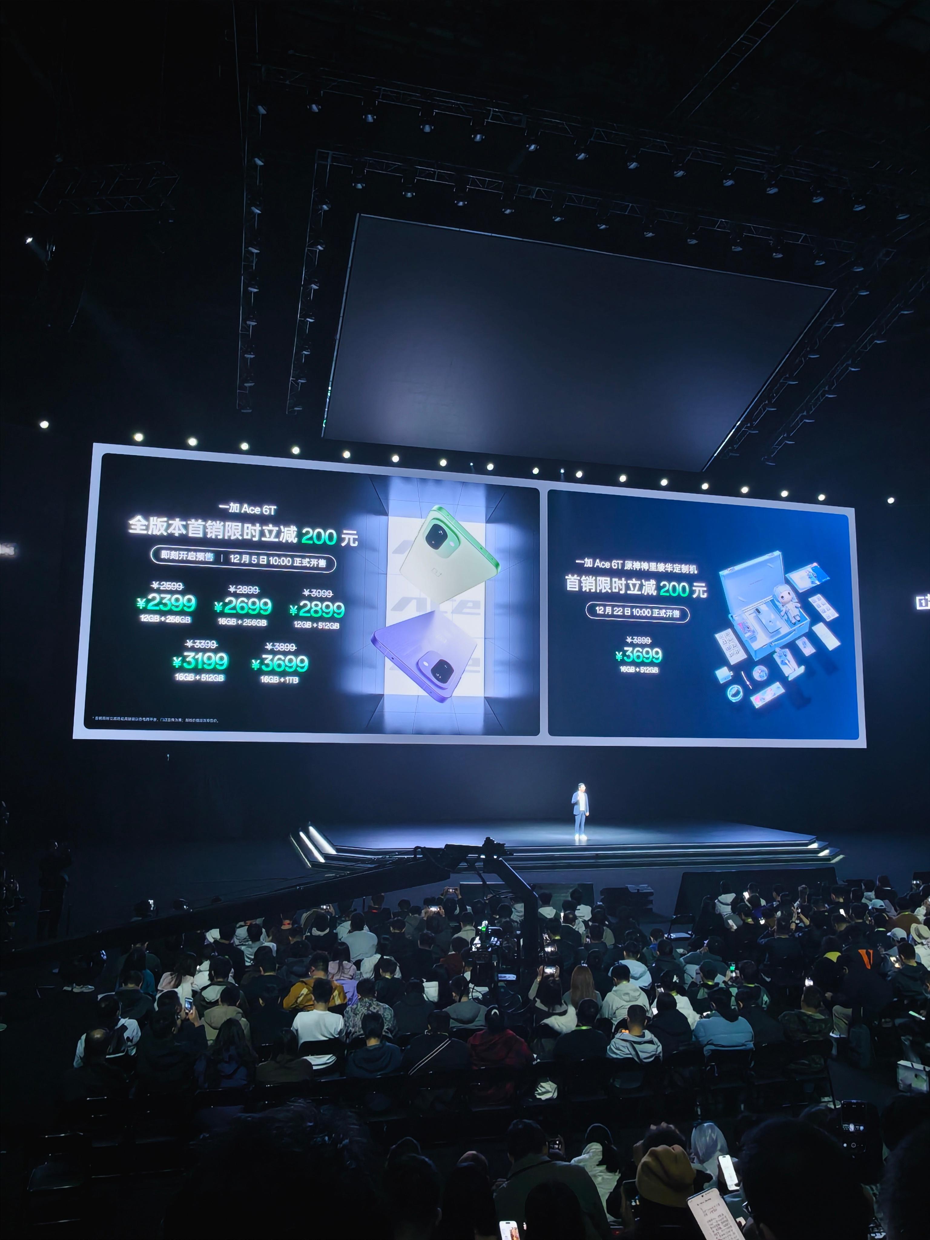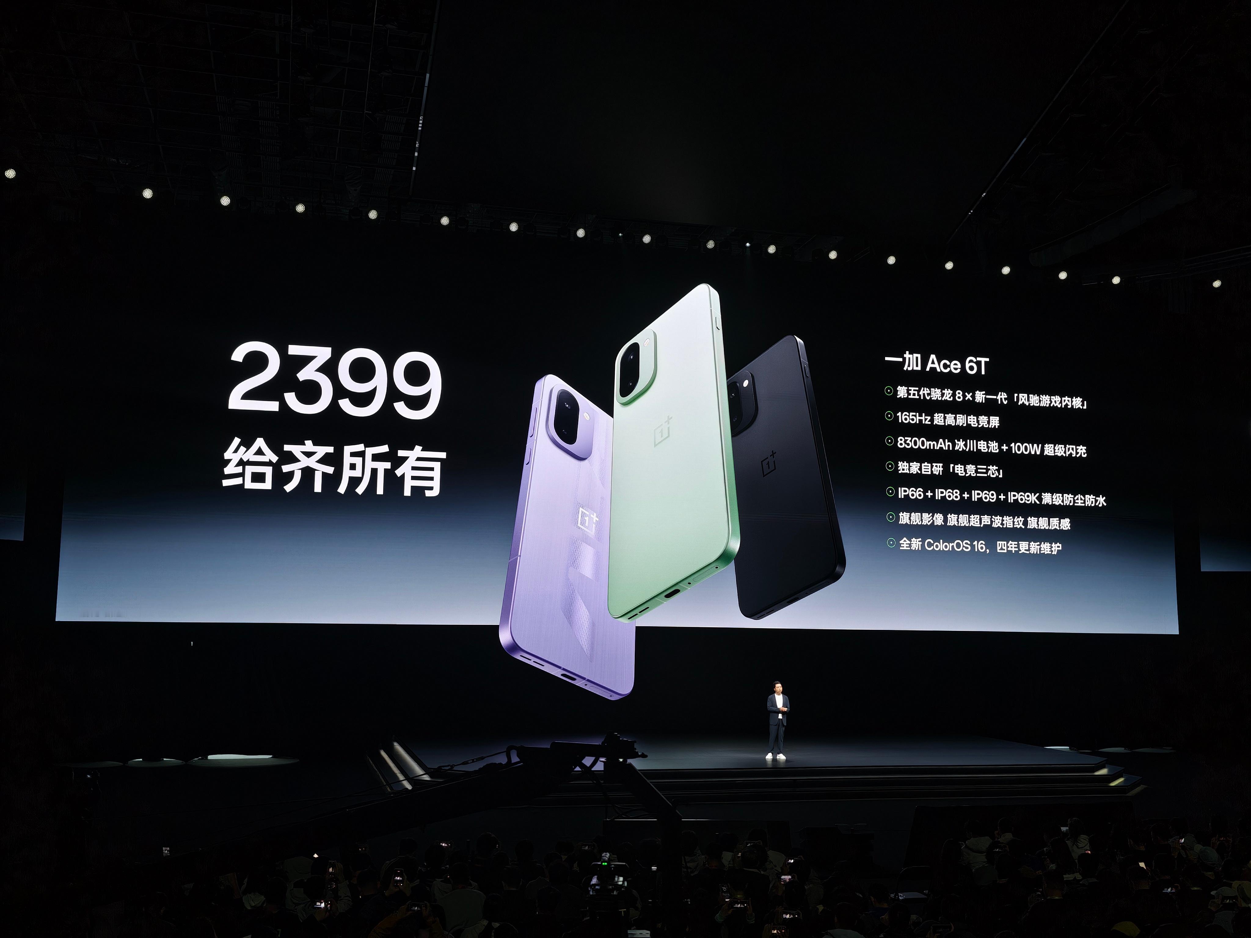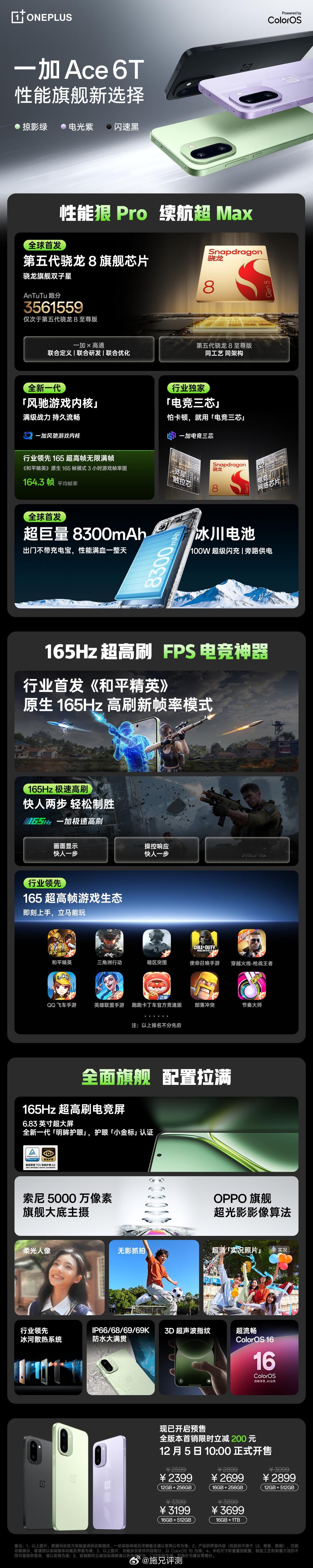 一张图读懂 「性能旗舰新选择」一加 Ace 6T到手价2399 元起,太狠了!一加 Ace 6T 全球首发搭载第五代骁龙8移动旗舰平台,写入全新一代「风驰游戏内核」,搭配全新「冰河散热系统」以及「电竞三芯」,实现同档唯一165无限满帧表现的同时,为玩家带来「快人两步,轻松制胜」的竞技优势。一加 Ace 6T配备同档唯一 165Hz 超高刷电竞屏,兼具出色显示素质与护眼能力。续航能力同样领跑同档,8300mAh超巨量冰川电池与100W超级闪充的超强组合,带来长效续航与快速补电的双重保障。还标配3D超声波屏幕指纹解锁与IP66/IP68/IP69/IP69K满级防尘防水,以及集流畅性能、AI智能与跨生态体验于一体的全新 ColorOS 16,带来更智慧更顺畅的使用体验。一加 Ace 6T 将于12月5日10:00全渠道正式开售,到手价2399 元起;一加 Ace 6T 原神神里绫华定制机将于12月22日10:00正式开售,到手价3699元。一加Ace6T新品发布你用过165Hz手机打游戏吗