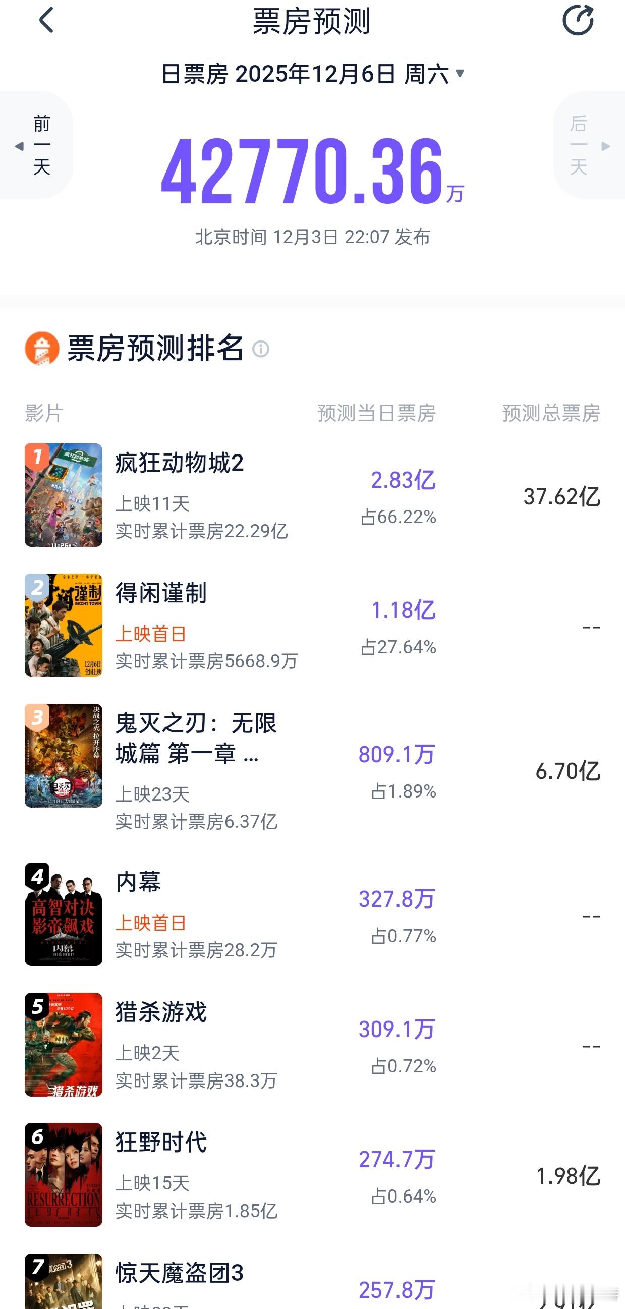 听听温特怎么说本周六猫淘预测出来了,日票房4.2亿,《疯狂动物城2》2.8亿,《得闲谨制》1亿—1.18亿。