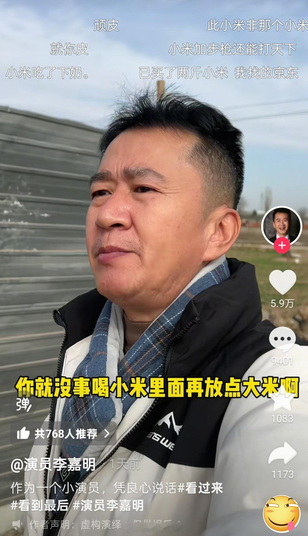 演员李嘉明说有钱就买小米,随便问一个人都说小米好,后面话峰一转表示大家没事就喝点小米,听他的准没错