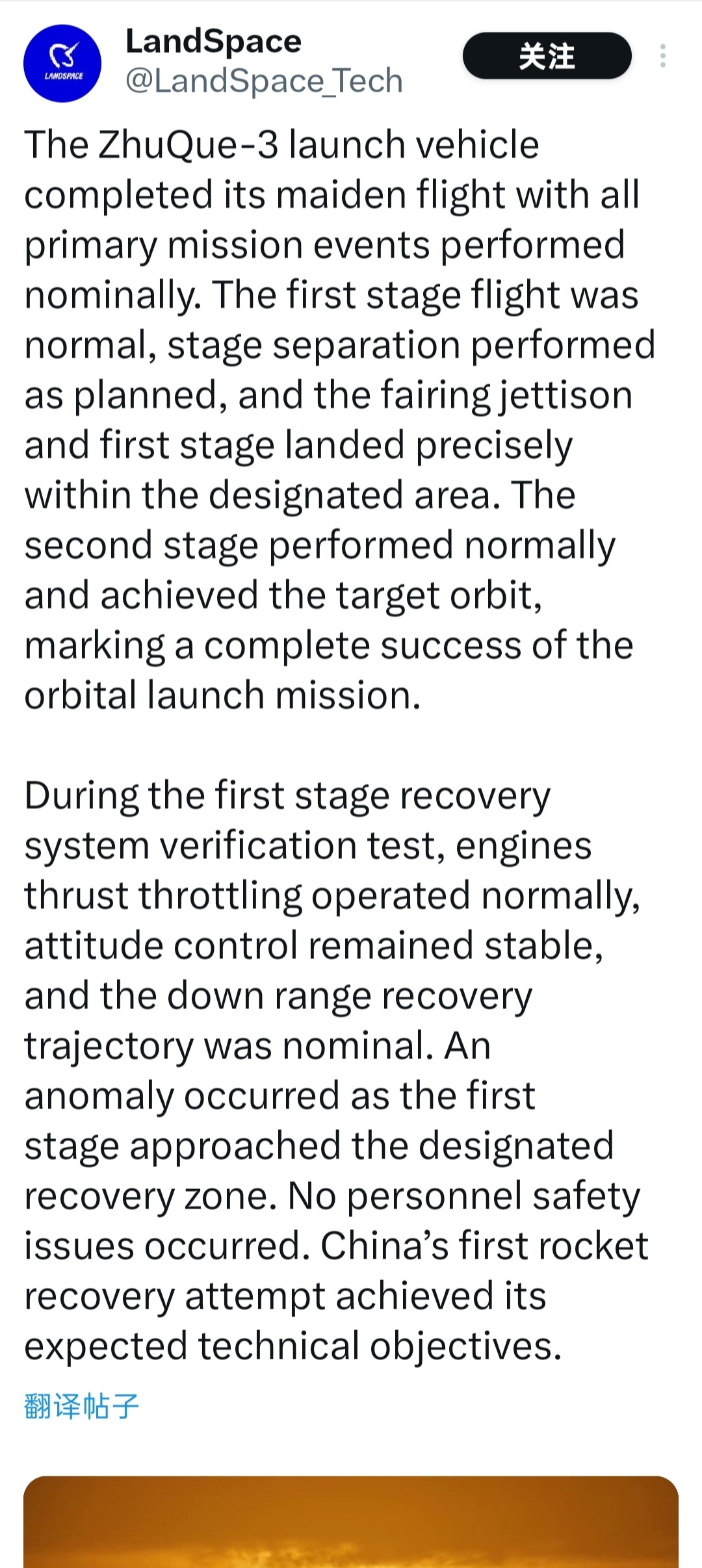 蓝箭航天在X上的官方通稿;朱雀三号 一级火箭精确着陆于指定区域。二级火箭运行正常,成功进入目标轨道,发射任务圆满成功。第一级回收系统验证试验中,发动机推力调节正常,姿态控制稳定,回收轨迹符合预期。第一级在接近指定回收区时出现异常情况,但未造成人员安全问题,中国首次火箭回收试验达到了预期的技术目标。