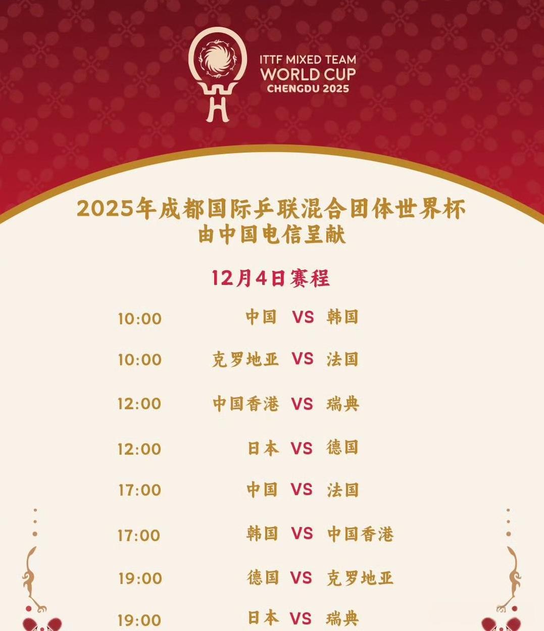 成都混合团体世界杯12月3日、4日赛程 按照赛制,第二阶段比赛时,在第一阶段交过手的将不再对决。由于第一阶段国乒与中国香港队交过手,所以在第二阶段国乒将与除中国香港队外的六支队伍进行大循环比赛。其他队也是如此。 第二轮循环赛后,积分成绩排名前四的队伍出线,晋级到半决赛。