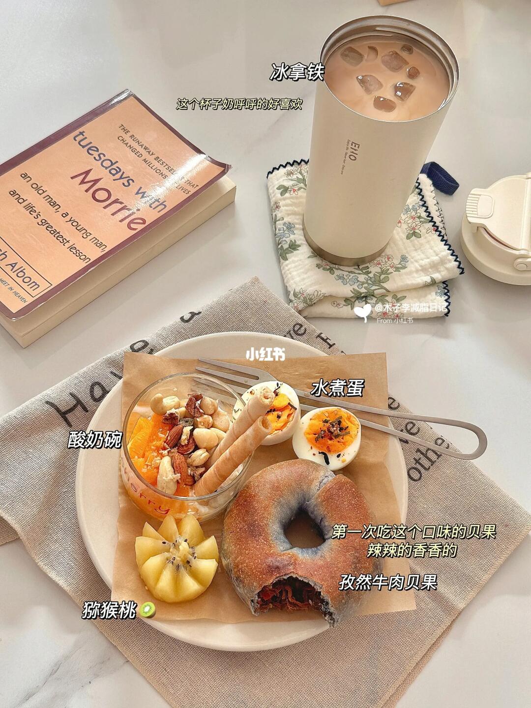 ●原体重:120斤 | 现重:90斤 | 已↓30斤 - 🥣早:冰拿铁 猕猴桃🥝 孜然牛肉贝果 酸奶碗 鸡蛋 🥣午:酸辣娃娃菜 牛肉炒西蓝花🥦 玉米 🥣晚:焖虾 乌龙茶 🥣加:奶茶 火龙果 💧喝水:1800ml 🏋️运动:🈚 - 💭第一次吃孜然牛肉贝果,还真滴很好吃😋反正对咸口的贝果是只有爱~还别说这个奶呼呼的杯子真好看,出去带着也方便哈! 💭下午喝了奶茶,晚上就吃点虾补充蛋白质吧!好顶饱的 💭这两天不知道怎么回事嗯嗯很难!每天蔬菜 喝水也挺多呀 ……嗯嗯不畅会好难过哎😭
