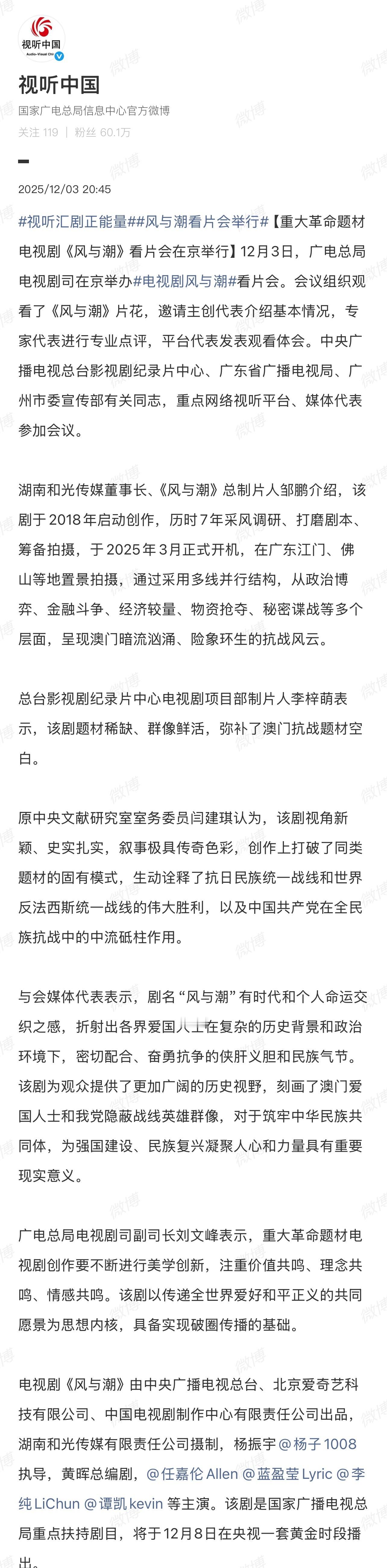 重大革命题材剧《风与潮》看片会举办,这部聚焦澳门抗战的剧作历时7年打磨,以多线叙事展现隐蔽战线风云,填补题材空白。期待任嘉伦12月8日央视一套黄金档开播!