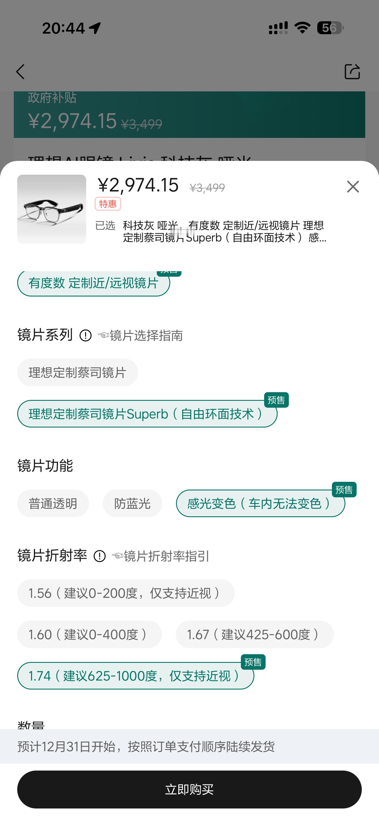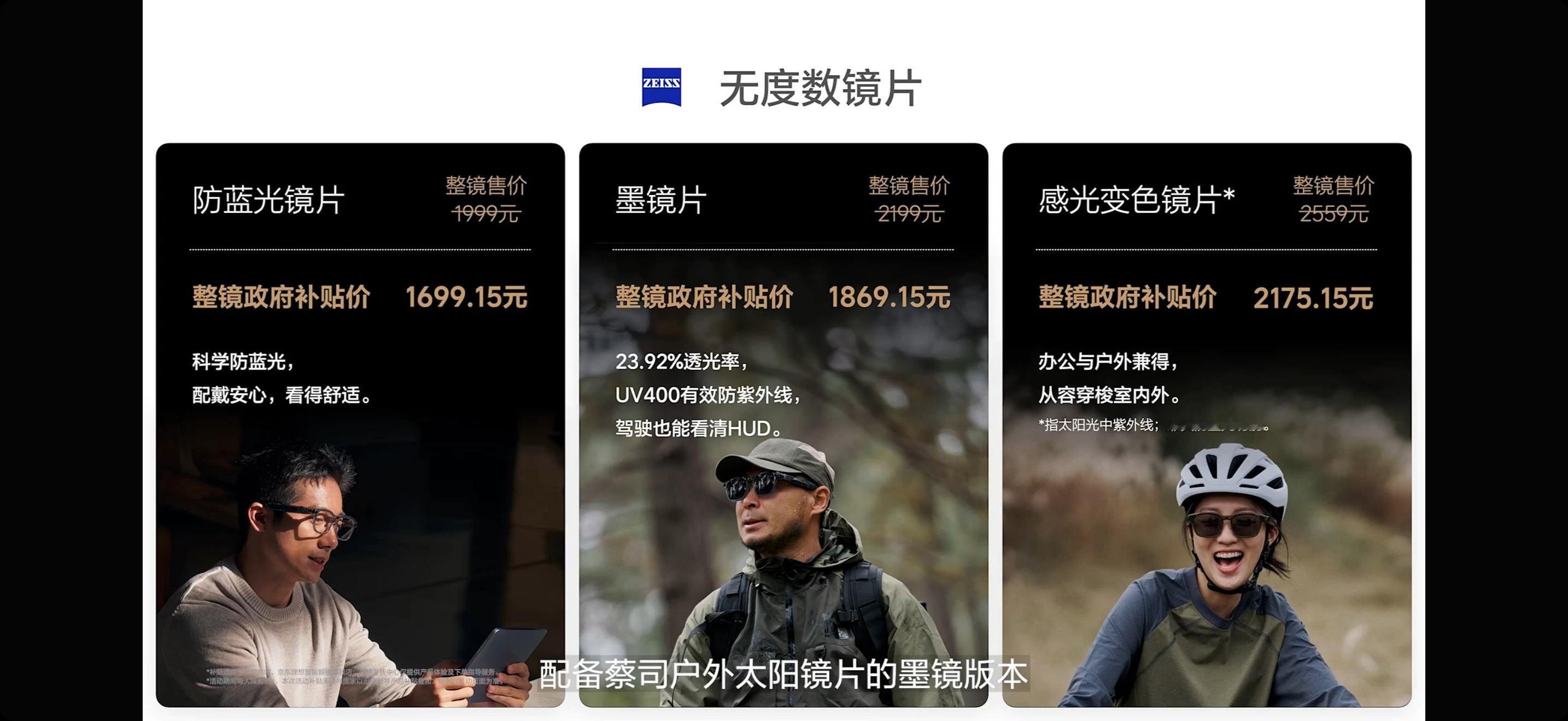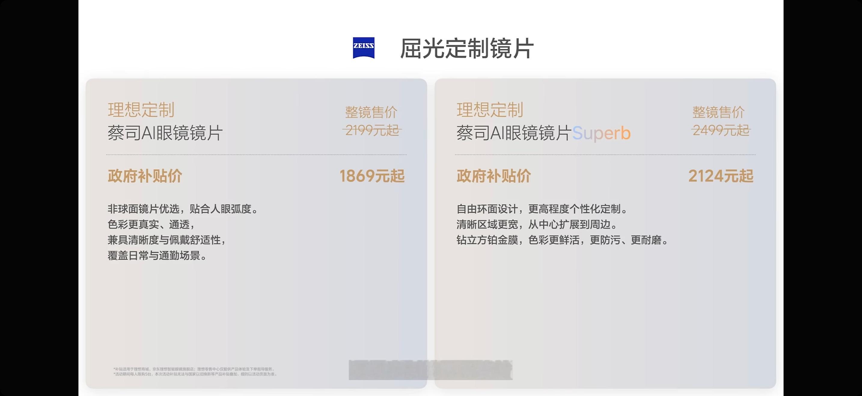 理想AI眼镜Livis理想的 Livis 智能 AI 眼镜 1999元起,而且享受国补,补贴后1699元~非常狠的价格,之前有人猜测3000多来着。全系标配蔡司镜片。还可以选配不同的镜片组合,蔡司镜片还是贵,最贵的需要加1500元(自由环面镜片,超过600度近视的1.74折射率,变色镜片)。 配合国补能优惠到2974.15元,也就是最贵也就2974.15元)