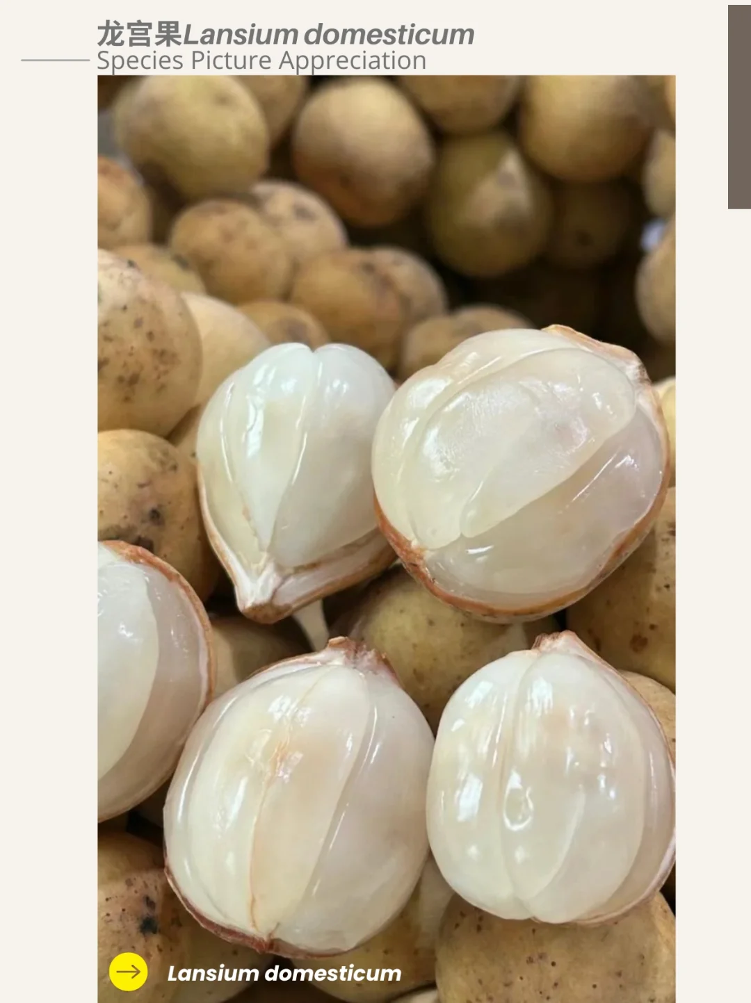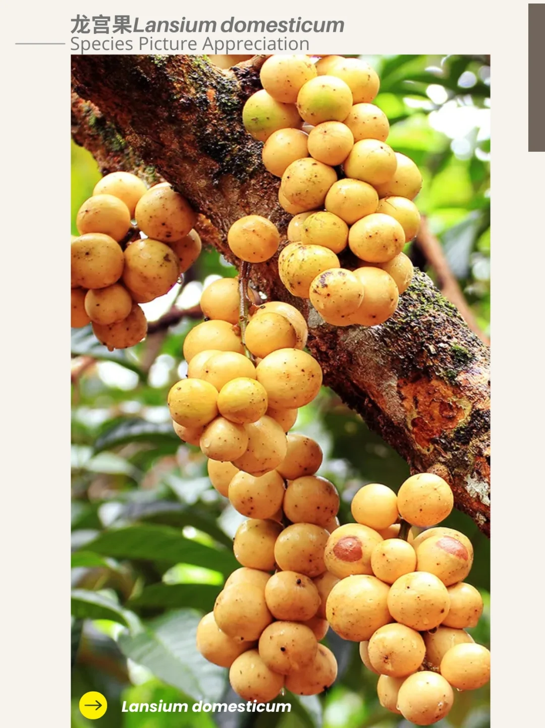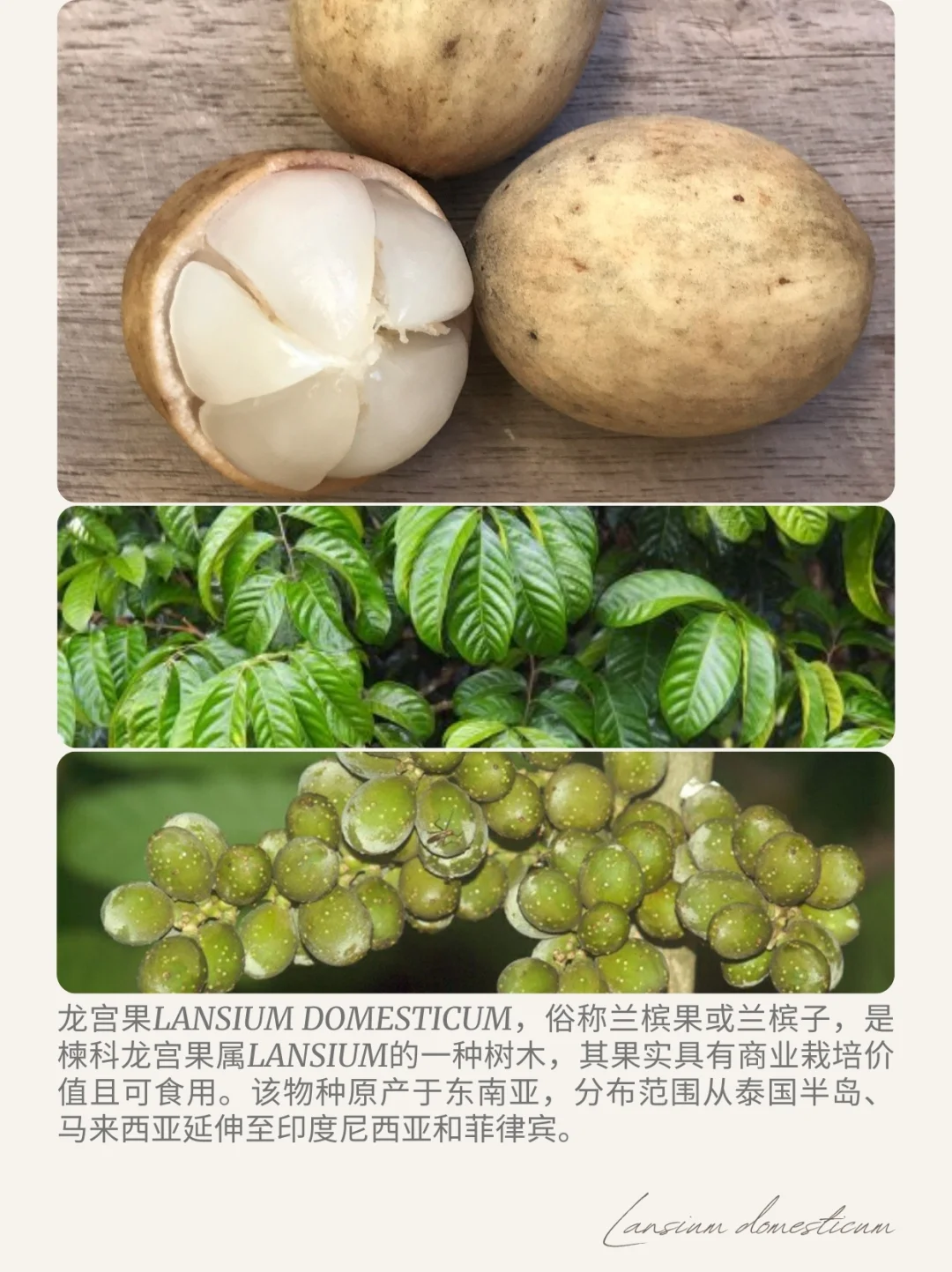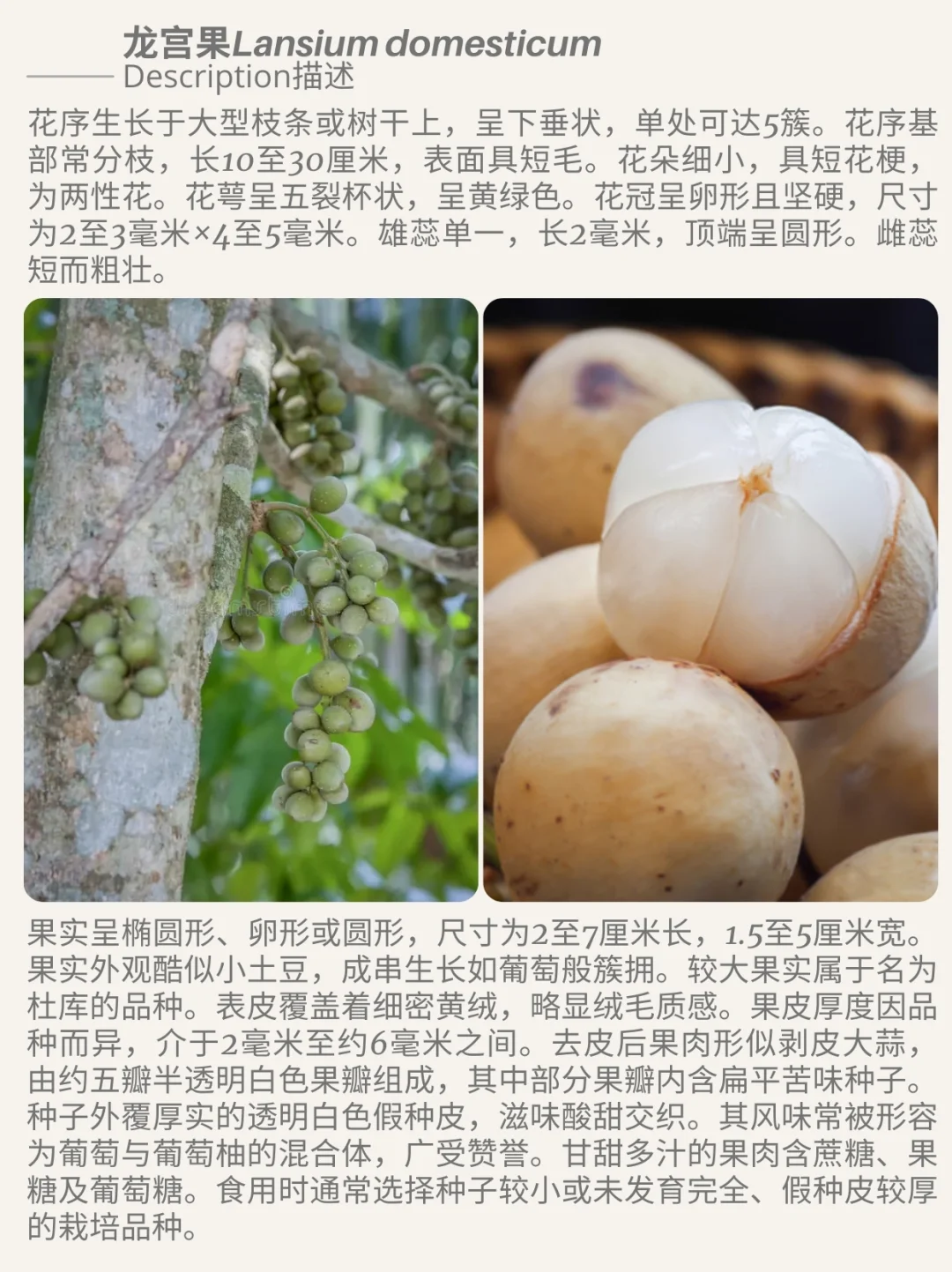 热带水果 讨好型水果 龙宫果 楝科 Lansium 东南亚 榴莲 红毛丹 山竹 龙宫果Lansium domesticum,俗称兰槟果或兰槟子,是楝科龙宫果属Lansium的一种树木,其果实具有商业栽培价值且可食用。该物种原产于东南亚,分布范围从泰国半岛、马来西亚延伸至印度尼西亚和菲律宾。 该树种中等大小,可达30米高,直径75厘米。由种子培育、株距8×8米种植的30年树龄树木,可达10米高,直径25厘米。树干生长不规则,其板根系统露出地面。树皮呈灰褐色,布满深浅不一的斑点。树脂质地浓稠,呈乳白色。羽状复叶呈奇数对生,叶面覆有细毛,间隔生长着6至9枚芽。芽体呈长椭圆形,尺寸约9至21厘米×5至10厘米。芽尖边缘具光泽,叶片基部与顶端均呈尖锐状。芽柄直径为5至12毫米。 果实呈椭圆形、卵形或圆形,尺寸为2至7厘米长,1.5至5厘米宽。果实外观酷似小土豆,成串生长如葡萄般簇拥。较大果实属于名为杜库的品种。表皮覆盖着细密黄绒,略显绒毛质感。果皮厚度因品种而异,介于2毫米至约6毫米之间。去皮后果肉形似剥皮大蒜,由约五瓣半透明白色果瓣组成,其中部分果瓣内含扁平苦味种子。种子外覆厚实的透明白色假种皮,滋味酸甜交织。其风味常被形容为葡萄与葡萄柚的混合体,广受赞誉。甘甜多汁的果肉含蔗糖、果糖及葡萄糖。食用时通常选择种子较小或未发育完全、假种皮较厚的栽培品种。 龙宫果树的主要生产国为菲律宾、印度尼西亚、泰国和马来西亚。其产量主要满足国内消费,部分产品出口至新加坡、香港及科威特。该树种主要因其可生食的果实而被栽培,果实亦可制成糖水罐头。其木材质地坚硬、厚实、沉重且富有韧性,常用于乡村房屋建造。 菲律宾卡米金岛每年十月举办兰宗节,以庆祝这种水果及其岛上卡米金马诺博族人的本土文化。菲律宾北部拉古纳省的帕埃特镇,也在每年九月的第三周举办帕埃特-塔卡-兰宗节。西内格罗斯省塔利赛市康塞普西翁行政村——“康塞普西翁”品种的发源地——亦通过马拉杜拉节(Maradula Festival,取自Marang马朗(极香面包果)、Mangosteen山竹、Nephelium lappaceum红毛丹、Durian榴槤与Lanzones龙宫果的英文首字母缩写)庆祝这种水果。马拉杜拉节在1980年代原名“兰果节”,2009年更名以涵盖更多本地水果产品,并避免与卡米金岛的同名节日混淆。