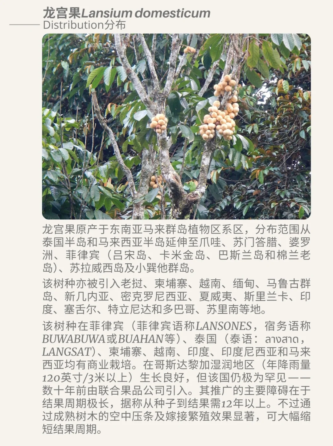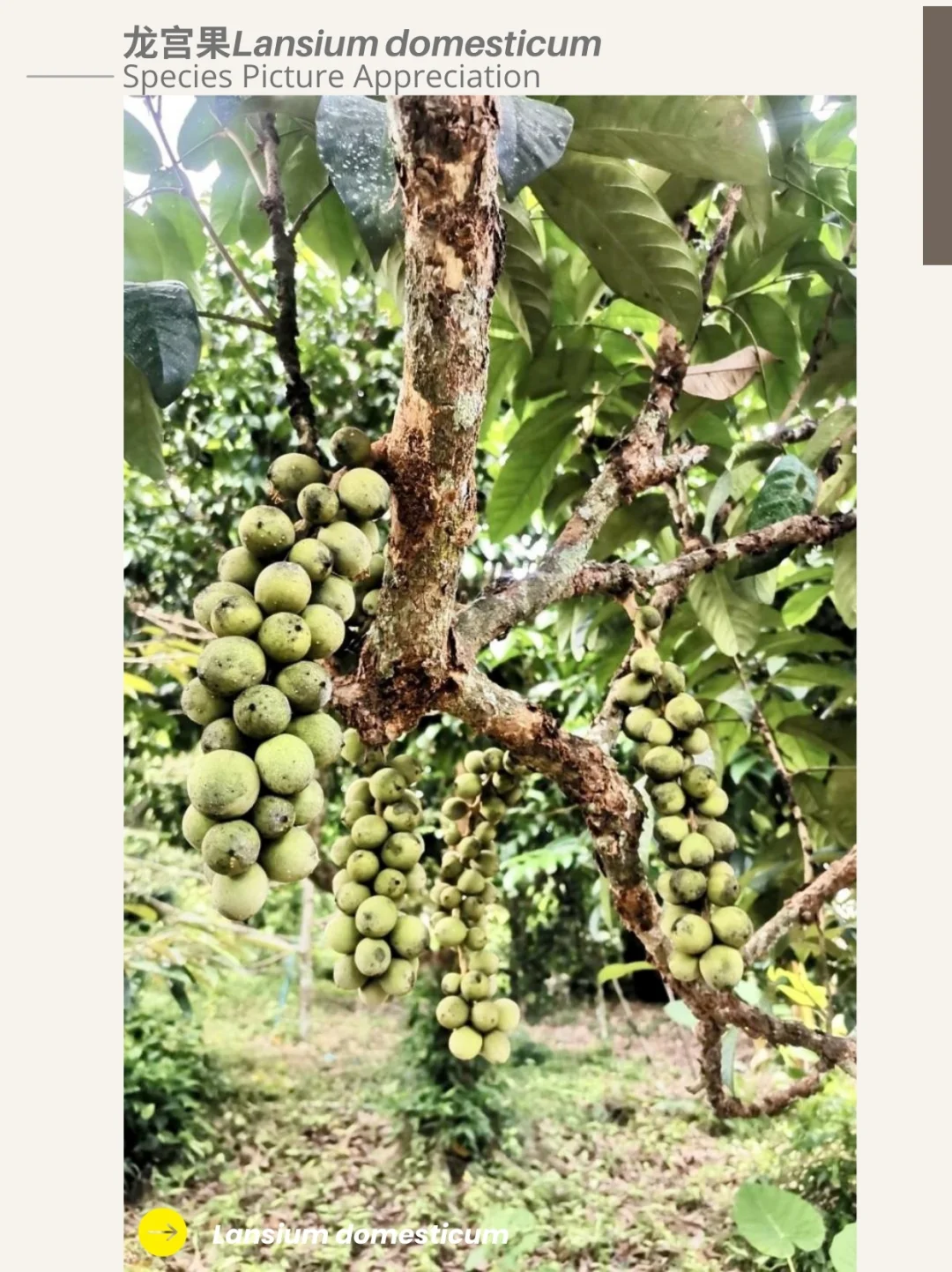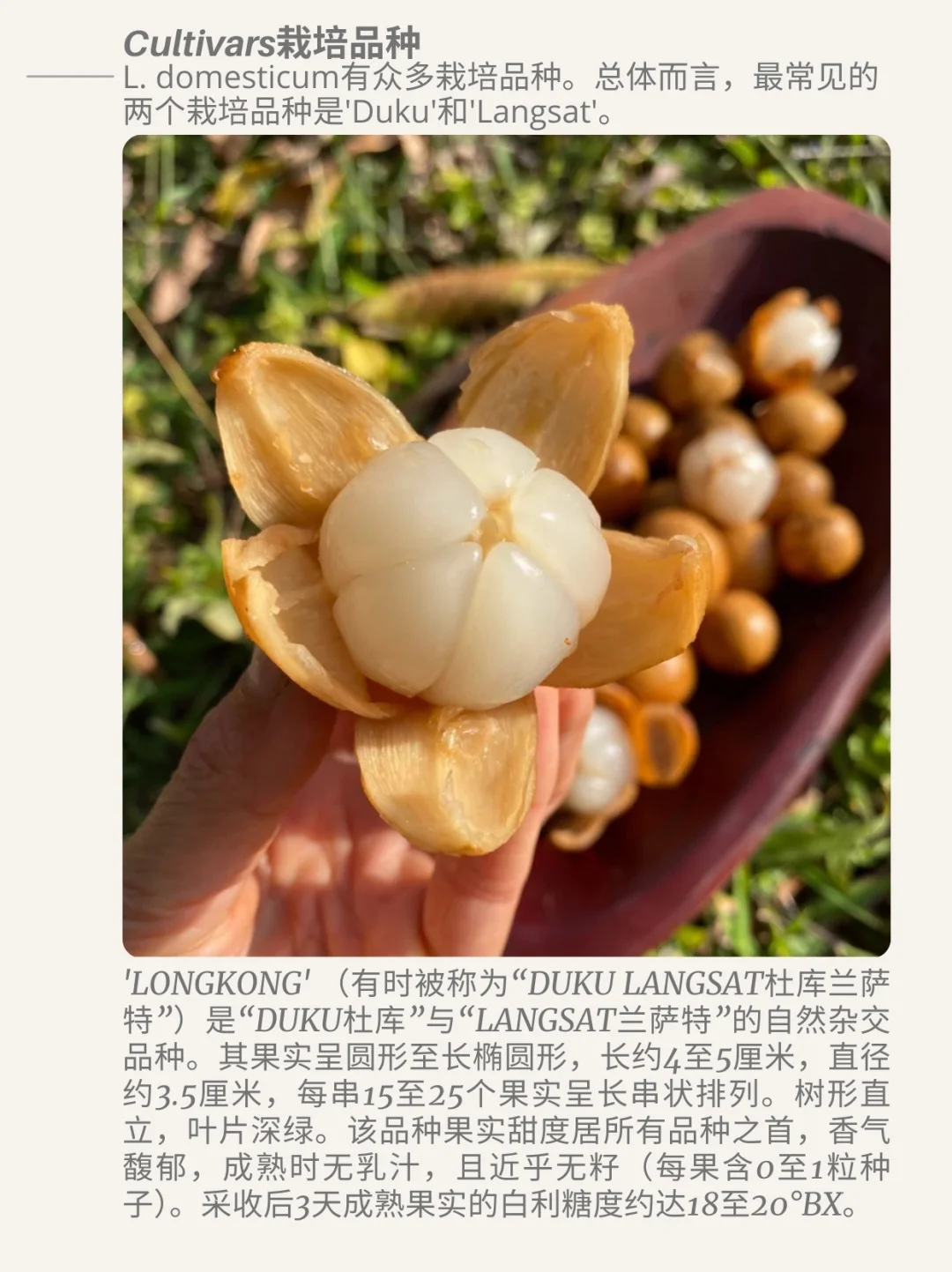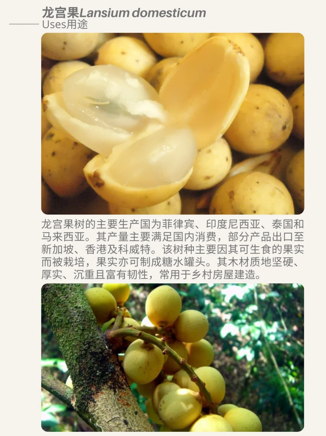 热带水果 讨好型水果 龙宫果 楝科 Lansium 东南亚 榴莲 红毛丹 山竹 龙宫果Lansium domesticum,俗称兰槟果或兰槟子,是楝科龙宫果属Lansium的一种树木,其果实具有商业栽培价值且可食用。该物种原产于东南亚,分布范围从泰国半岛、马来西亚延伸至印度尼西亚和菲律宾。 该树种中等大小,可达30米高,直径75厘米。由种子培育、株距8×8米种植的30年树龄树木,可达10米高,直径25厘米。树干生长不规则,其板根系统露出地面。树皮呈灰褐色,布满深浅不一的斑点。树脂质地浓稠,呈乳白色。羽状复叶呈奇数对生,叶面覆有细毛,间隔生长着6至9枚芽。芽体呈长椭圆形,尺寸约9至21厘米×5至10厘米。芽尖边缘具光泽,叶片基部与顶端均呈尖锐状。芽柄直径为5至12毫米。 果实呈椭圆形、卵形或圆形,尺寸为2至7厘米长,1.5至5厘米宽。果实外观酷似小土豆,成串生长如葡萄般簇拥。较大果实属于名为杜库的品种。表皮覆盖着细密黄绒,略显绒毛质感。果皮厚度因品种而异,介于2毫米至约6毫米之间。去皮后果肉形似剥皮大蒜,由约五瓣半透明白色果瓣组成,其中部分果瓣内含扁平苦味种子。种子外覆厚实的透明白色假种皮,滋味酸甜交织。其风味常被形容为葡萄与葡萄柚的混合体,广受赞誉。甘甜多汁的果肉含蔗糖、果糖及葡萄糖。食用时通常选择种子较小或未发育完全、假种皮较厚的栽培品种。 龙宫果树的主要生产国为菲律宾、印度尼西亚、泰国和马来西亚。其产量主要满足国内消费,部分产品出口至新加坡、香港及科威特。该树种主要因其可生食的果实而被栽培,果实亦可制成糖水罐头。其木材质地坚硬、厚实、沉重且富有韧性,常用于乡村房屋建造。 菲律宾卡米金岛每年十月举办兰宗节,以庆祝这种水果及其岛上卡米金马诺博族人的本土文化。菲律宾北部拉古纳省的帕埃特镇,也在每年九月的第三周举办帕埃特-塔卡-兰宗节。西内格罗斯省塔利赛市康塞普西翁行政村——“康塞普西翁”品种的发源地——亦通过马拉杜拉节(Maradula Festival,取自Marang马朗(极香面包果)、Mangosteen山竹、Nephelium lappaceum红毛丹、Durian榴槤与Lanzones龙宫果的英文首字母缩写)庆祝这种水果。马拉杜拉节在1980年代原名“兰果节”,2009年更名以涵盖更多本地水果产品,并避免与卡米金岛的同名节日混淆。