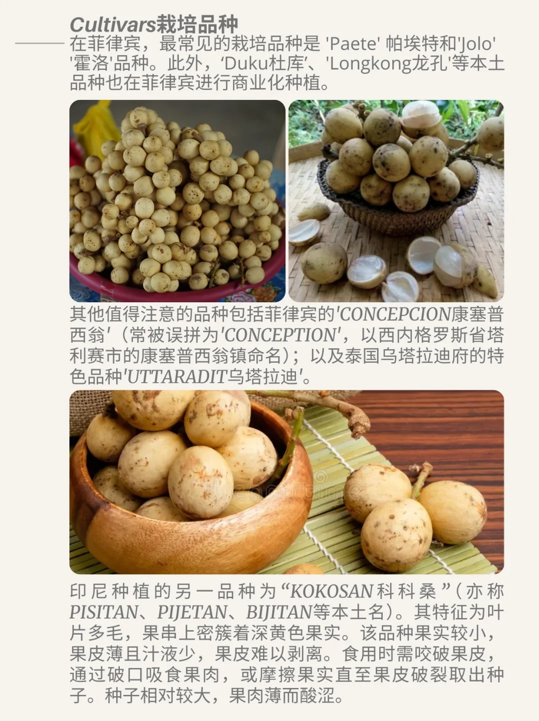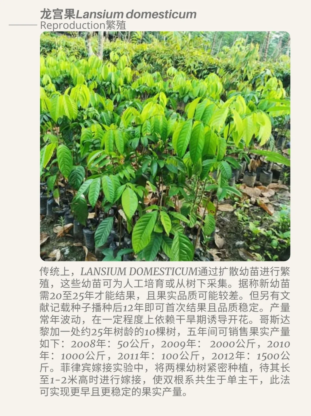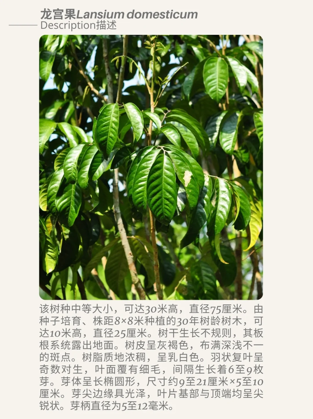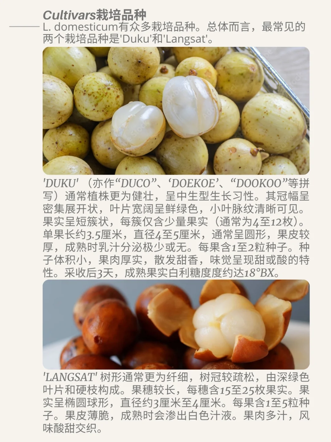热带水果 讨好型水果 龙宫果 楝科 Lansium 东南亚 榴莲 红毛丹 山竹 龙宫果Lansium domesticum,俗称兰槟果或兰槟子,是楝科龙宫果属Lansium的一种树木,其果实具有商业栽培价值且可食用。该物种原产于东南亚,分布范围从泰国半岛、马来西亚延伸至印度尼西亚和菲律宾。 该树种中等大小,可达30米高,直径75厘米。由种子培育、株距8×8米种植的30年树龄树木,可达10米高,直径25厘米。树干生长不规则,其板根系统露出地面。树皮呈灰褐色,布满深浅不一的斑点。树脂质地浓稠,呈乳白色。羽状复叶呈奇数对生,叶面覆有细毛,间隔生长着6至9枚芽。芽体呈长椭圆形,尺寸约9至21厘米×5至10厘米。芽尖边缘具光泽,叶片基部与顶端均呈尖锐状。芽柄直径为5至12毫米。 果实呈椭圆形、卵形或圆形,尺寸为2至7厘米长,1.5至5厘米宽。果实外观酷似小土豆,成串生长如葡萄般簇拥。较大果实属于名为杜库的品种。表皮覆盖着细密黄绒,略显绒毛质感。果皮厚度因品种而异,介于2毫米至约6毫米之间。去皮后果肉形似剥皮大蒜,由约五瓣半透明白色果瓣组成,其中部分果瓣内含扁平苦味种子。种子外覆厚实的透明白色假种皮,滋味酸甜交织。其风味常被形容为葡萄与葡萄柚的混合体,广受赞誉。甘甜多汁的果肉含蔗糖、果糖及葡萄糖。食用时通常选择种子较小或未发育完全、假种皮较厚的栽培品种。 龙宫果树的主要生产国为菲律宾、印度尼西亚、泰国和马来西亚。其产量主要满足国内消费,部分产品出口至新加坡、香港及科威特。该树种主要因其可生食的果实而被栽培,果实亦可制成糖水罐头。其木材质地坚硬、厚实、沉重且富有韧性,常用于乡村房屋建造。 菲律宾卡米金岛每年十月举办兰宗节,以庆祝这种水果及其岛上卡米金马诺博族人的本土文化。菲律宾北部拉古纳省的帕埃特镇,也在每年九月的第三周举办帕埃特-塔卡-兰宗节。西内格罗斯省塔利赛市康塞普西翁行政村——“康塞普西翁”品种的发源地——亦通过马拉杜拉节(Maradula Festival,取自Marang马朗(极香面包果)、Mangosteen山竹、Nephelium lappaceum红毛丹、Durian榴槤与Lanzones龙宫果的英文首字母缩写)庆祝这种水果。马拉杜拉节在1980年代原名“兰果节”,2009年更名以涵盖更多本地水果产品,并避免与卡米金岛的同名节日混淆。