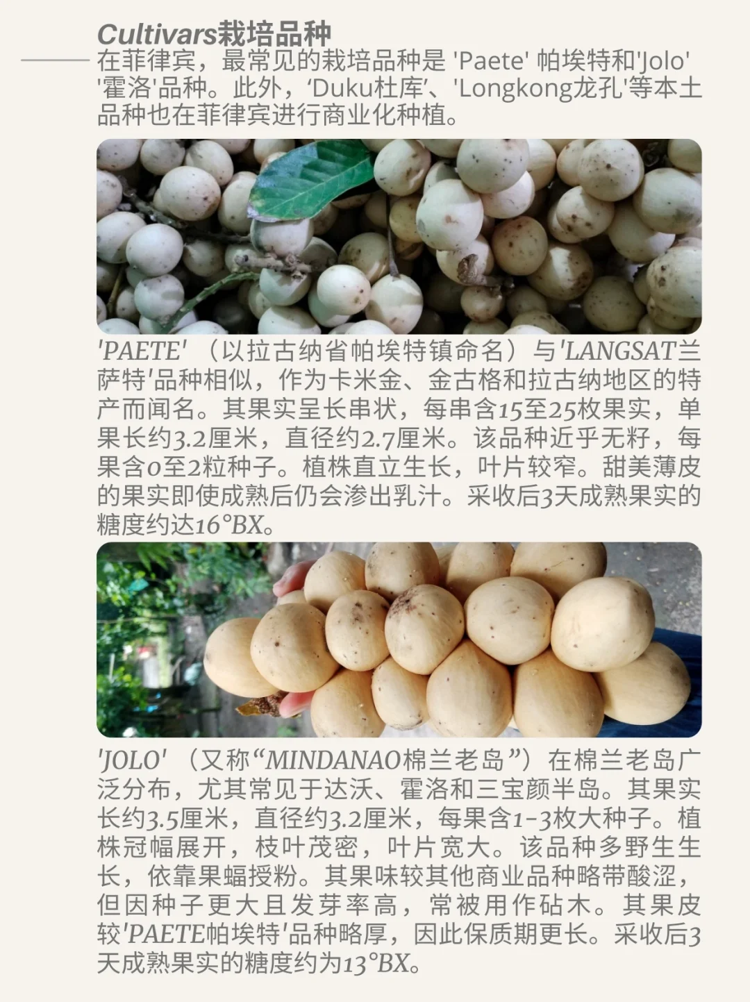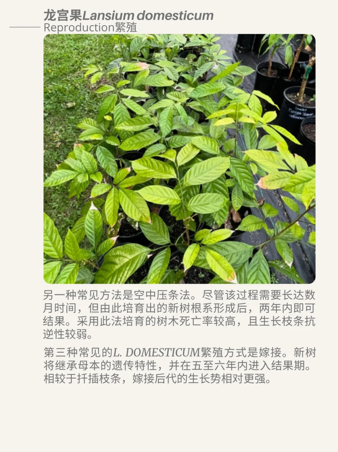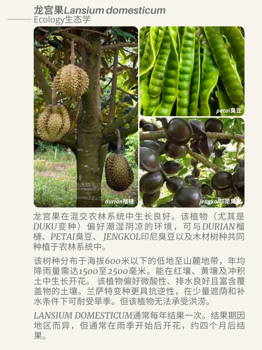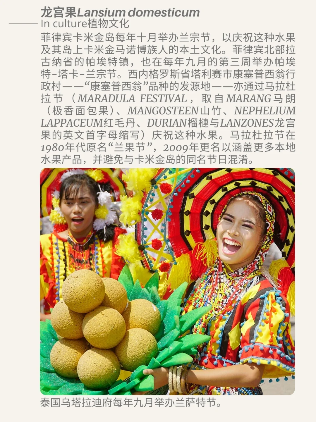 热带水果 讨好型水果 龙宫果 楝科 Lansium 东南亚 榴莲 红毛丹 山竹 龙宫果Lansium domesticum,俗称兰槟果或兰槟子,是楝科龙宫果属Lansium的一种树木,其果实具有商业栽培价值且可食用。该物种原产于东南亚,分布范围从泰国半岛、马来西亚延伸至印度尼西亚和菲律宾。 该树种中等大小,可达30米高,直径75厘米。由种子培育、株距8×8米种植的30年树龄树木,可达10米高,直径25厘米。树干生长不规则,其板根系统露出地面。树皮呈灰褐色,布满深浅不一的斑点。树脂质地浓稠,呈乳白色。羽状复叶呈奇数对生,叶面覆有细毛,间隔生长着6至9枚芽。芽体呈长椭圆形,尺寸约9至21厘米×5至10厘米。芽尖边缘具光泽,叶片基部与顶端均呈尖锐状。芽柄直径为5至12毫米。 果实呈椭圆形、卵形或圆形,尺寸为2至7厘米长,1.5至5厘米宽。果实外观酷似小土豆,成串生长如葡萄般簇拥。较大果实属于名为杜库的品种。表皮覆盖着细密黄绒,略显绒毛质感。果皮厚度因品种而异,介于2毫米至约6毫米之间。去皮后果肉形似剥皮大蒜,由约五瓣半透明白色果瓣组成,其中部分果瓣内含扁平苦味种子。种子外覆厚实的透明白色假种皮,滋味酸甜交织。其风味常被形容为葡萄与葡萄柚的混合体,广受赞誉。甘甜多汁的果肉含蔗糖、果糖及葡萄糖。食用时通常选择种子较小或未发育完全、假种皮较厚的栽培品种。 龙宫果树的主要生产国为菲律宾、印度尼西亚、泰国和马来西亚。其产量主要满足国内消费,部分产品出口至新加坡、香港及科威特。该树种主要因其可生食的果实而被栽培,果实亦可制成糖水罐头。其木材质地坚硬、厚实、沉重且富有韧性,常用于乡村房屋建造。 菲律宾卡米金岛每年十月举办兰宗节,以庆祝这种水果及其岛上卡米金马诺博族人的本土文化。菲律宾北部拉古纳省的帕埃特镇,也在每年九月的第三周举办帕埃特-塔卡-兰宗节。西内格罗斯省塔利赛市康塞普西翁行政村——“康塞普西翁”品种的发源地——亦通过马拉杜拉节(Maradula Festival,取自Marang马朗(极香面包果)、Mangosteen山竹、Nephelium lappaceum红毛丹、Durian榴槤与Lanzones龙宫果的英文首字母缩写)庆祝这种水果。马拉杜拉节在1980年代原名“兰果节”,2009年更名以涵盖更多本地水果产品,并避免与卡米金岛的同名节日混淆。