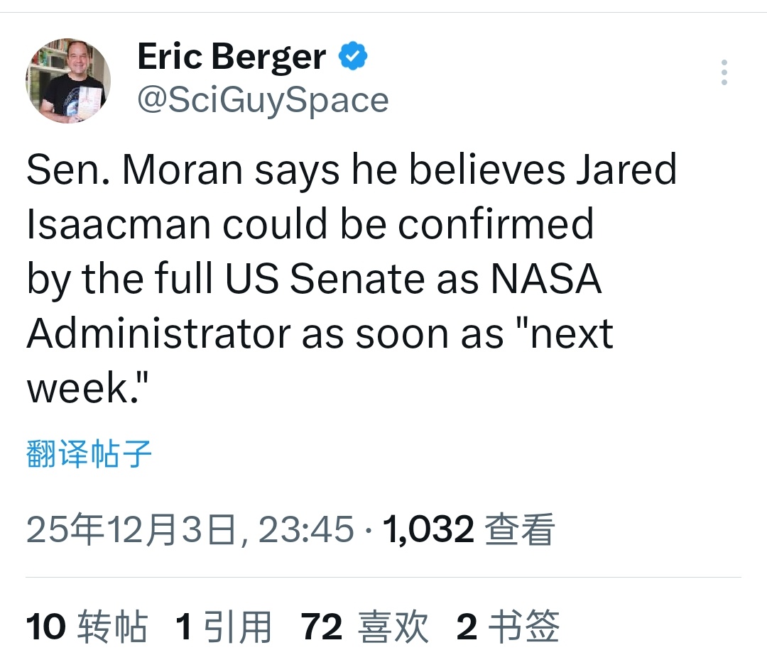 贾里德·艾萨克曼最早可能在下周获得美国参议院全体确认,出任美国国家航空航天局局长。