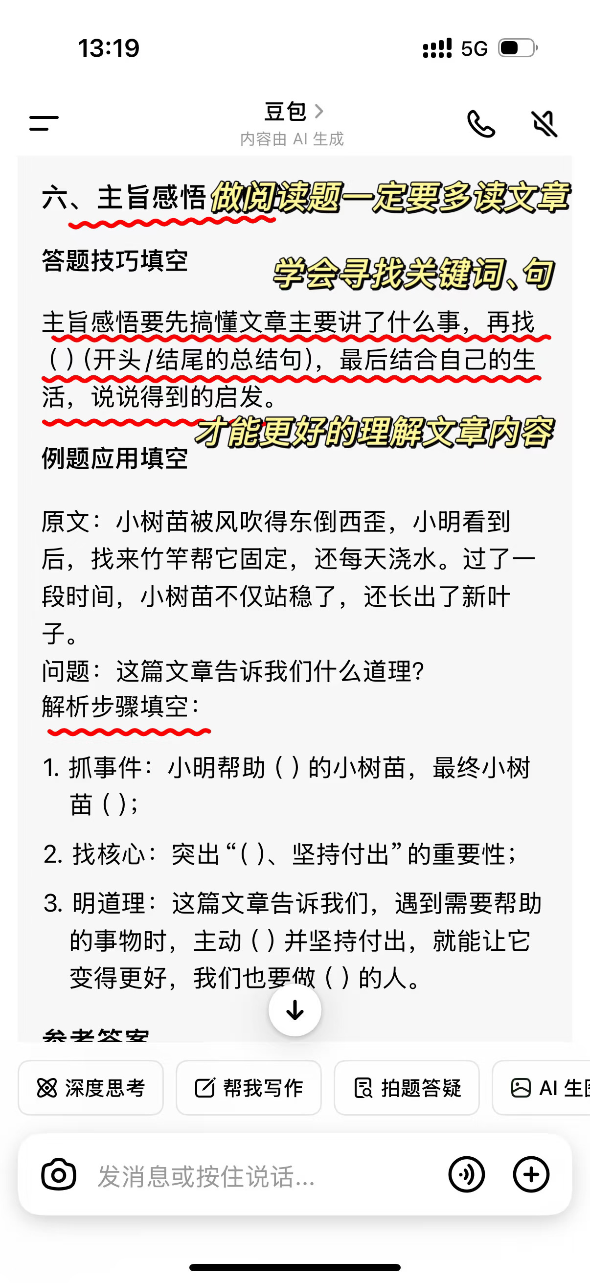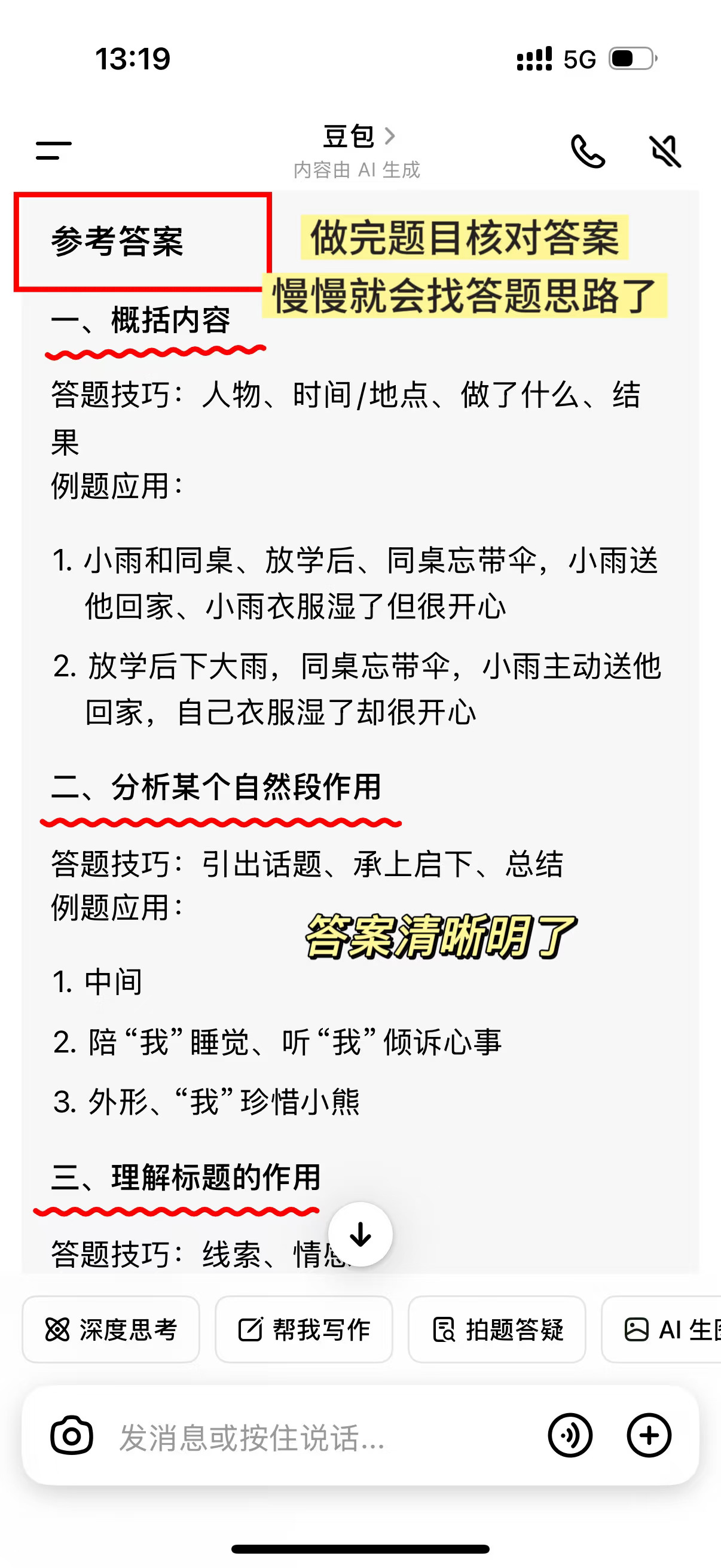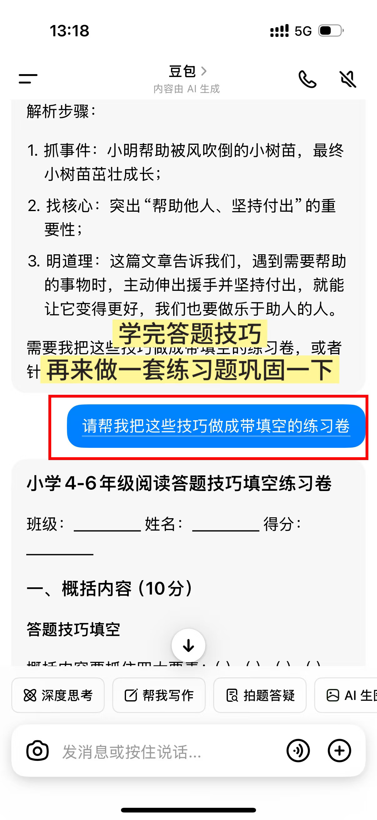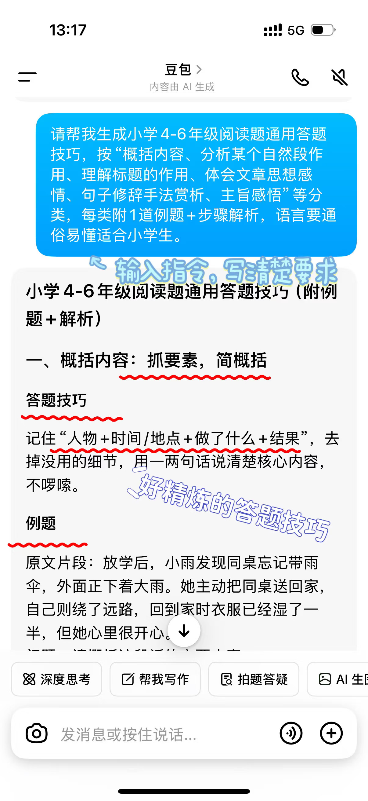 教小学中高年级语文的宝子们,谁懂整理阅读答题技巧的痛啊!😭真的太磨人了!因为前段时间我班好多孩子和我说答题没有思绪,不知道怎么抓重点,我就想着给他们整理一些阅读题的答题方法,不仅要理清“概括内容、段落作用、标题含义”这些高频考点,还要整理得通俗易懂,方便孩子理解和掌握。 昨晚我试着让豆包帮我整理阅读答题技巧,没想到它直接按6大核心题型分类,每类都配了小学生能秒懂的例题,还有一步步的解析步骤,语言直白易懂,也不用我怎么二次修改了。 题目还可以打印出来给学生当课堂练习,专项练习效率也高。 希望语文老师们都把更多精力放在课堂互动上,埋头整理资料这些很耗时间的事情就交给它去做吧!
