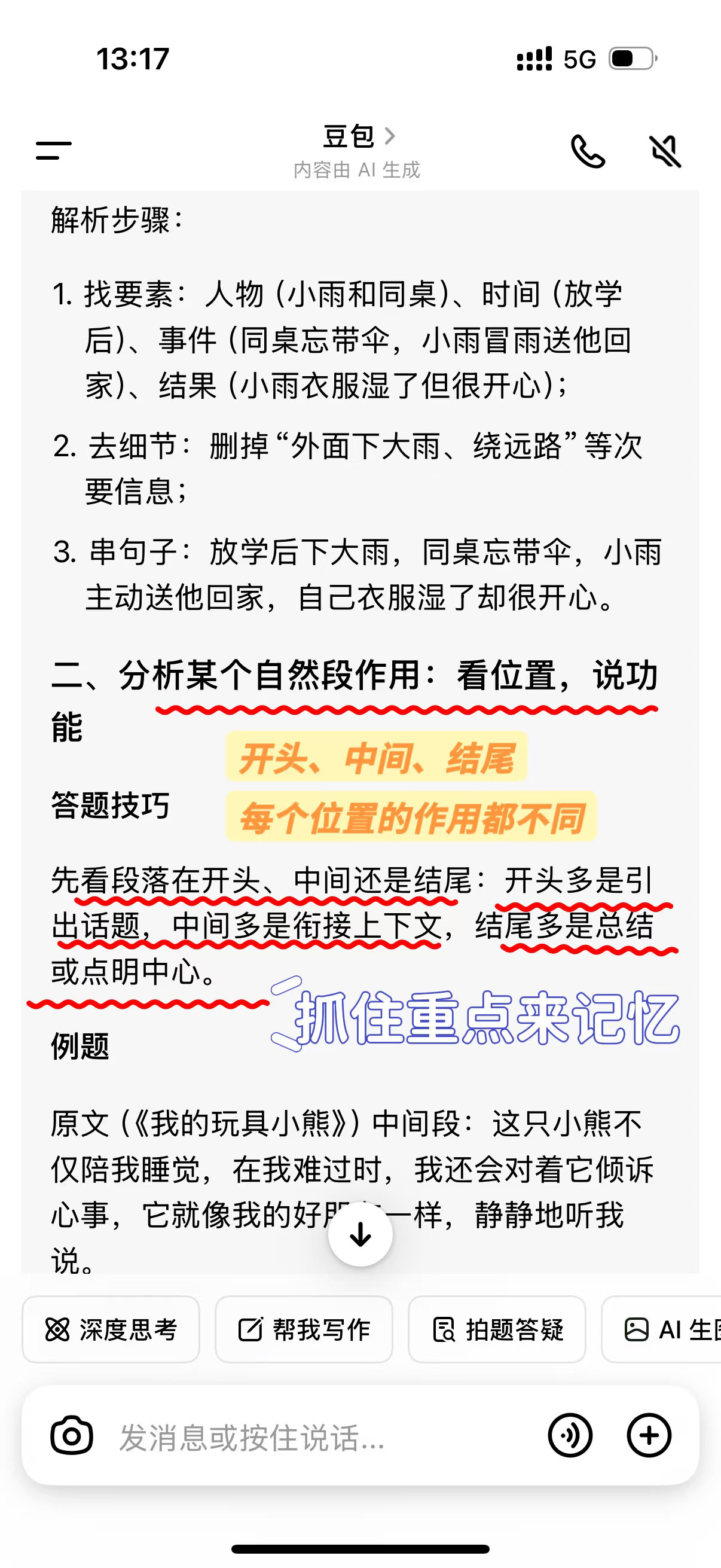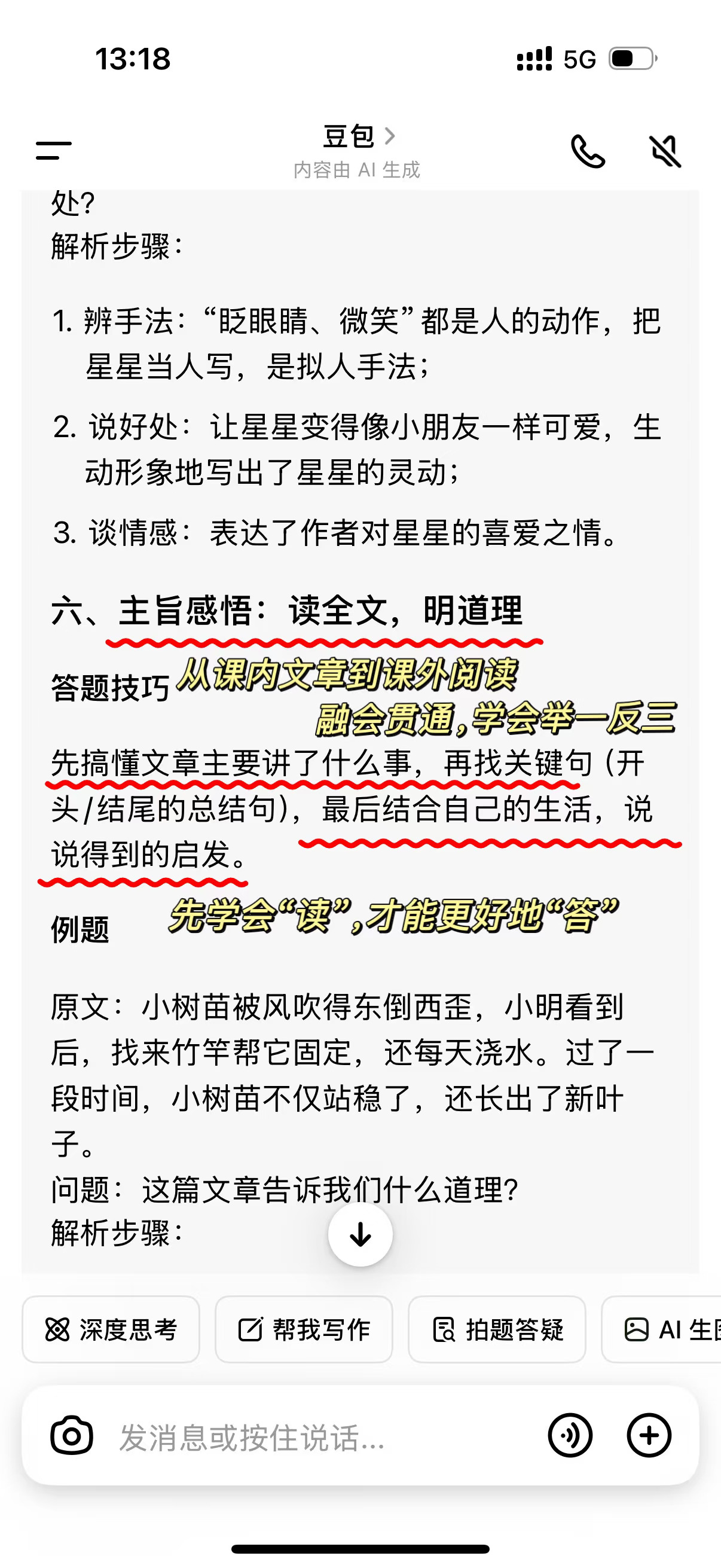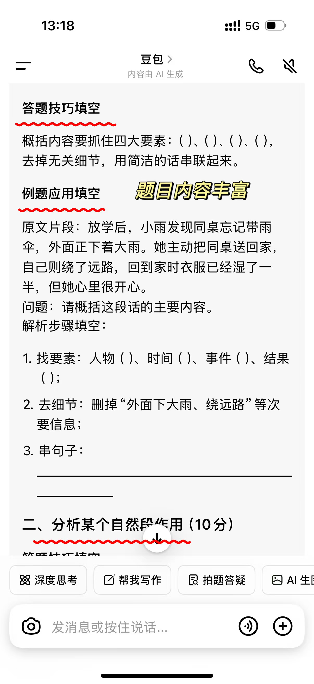 教小学中高年级语文的宝子们,谁懂整理阅读答题技巧的痛啊!😭真的太磨人了!因为前段时间我班好多孩子和我说答题没有思绪,不知道怎么抓重点,我就想着给他们整理一些阅读题的答题方法,不仅要理清“概括内容、段落作用、标题含义”这些高频考点,还要整理得通俗易懂,方便孩子理解和掌握。 昨晚我试着让豆包帮我整理阅读答题技巧,没想到它直接按6大核心题型分类,每类都配了小学生能秒懂的例题,还有一步步的解析步骤,语言直白易懂,也不用我怎么二次修改了。 题目还可以打印出来给学生当课堂练习,专项练习效率也高。 希望语文老师们都把更多精力放在课堂互动上,埋头整理资料这些很耗时间的事情就交给它去做吧!