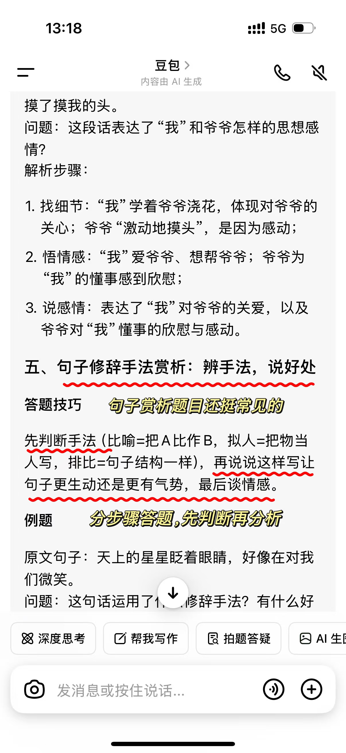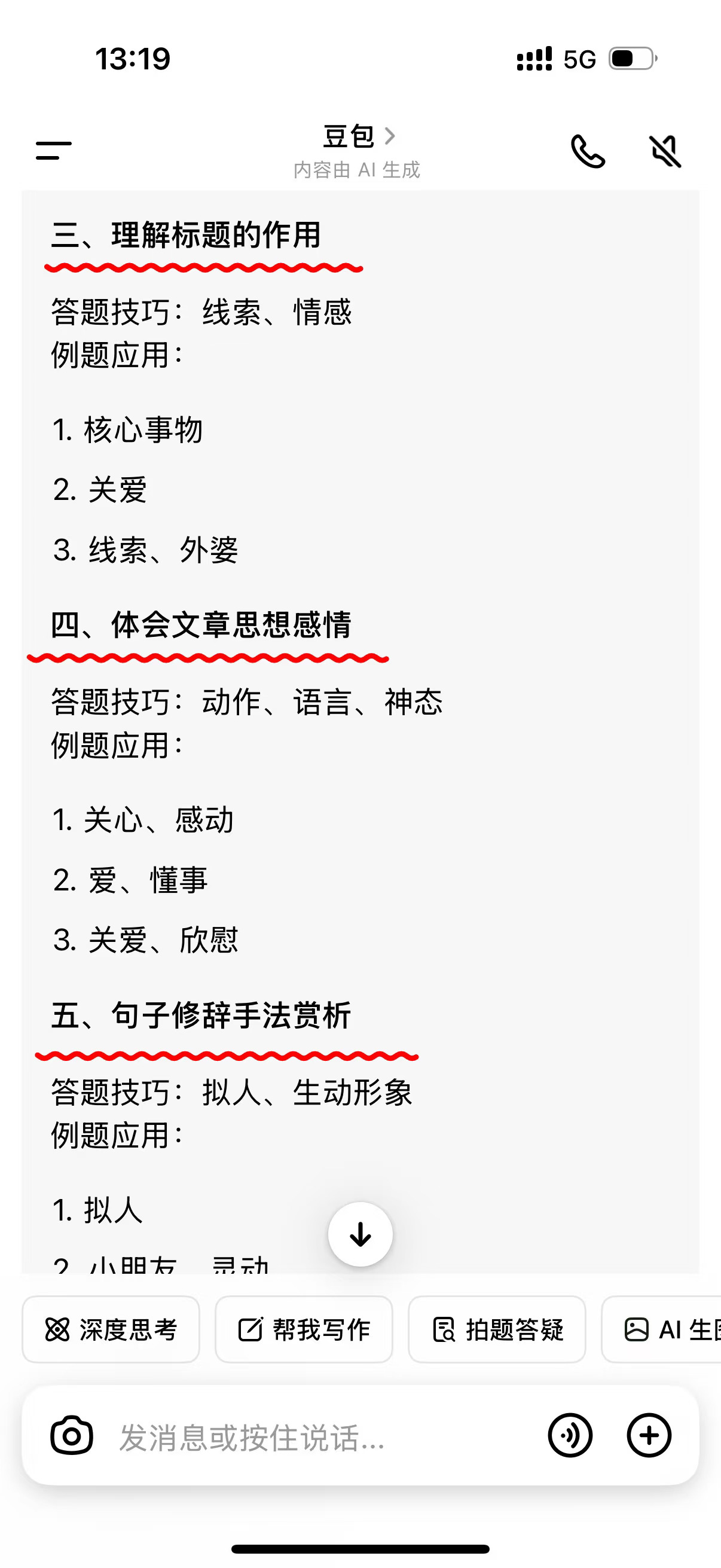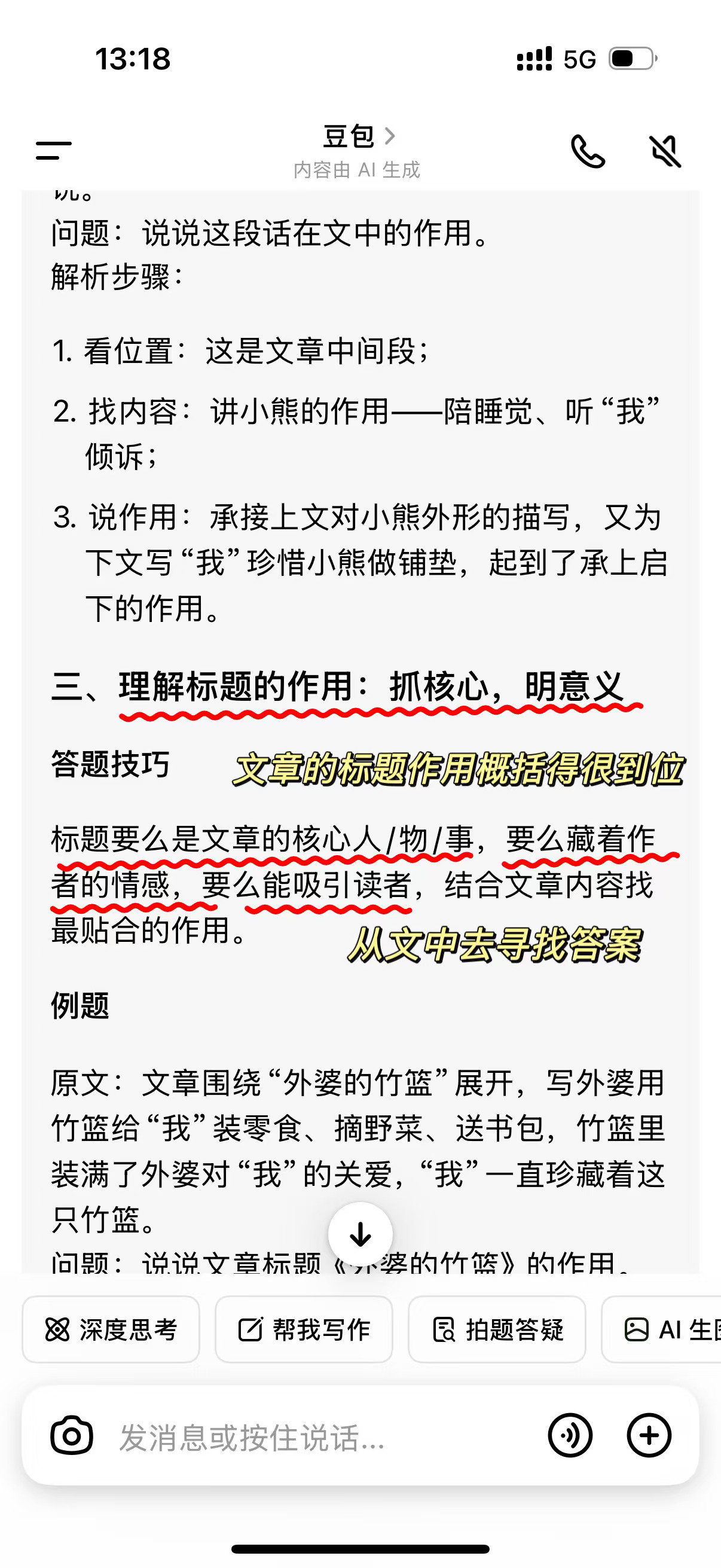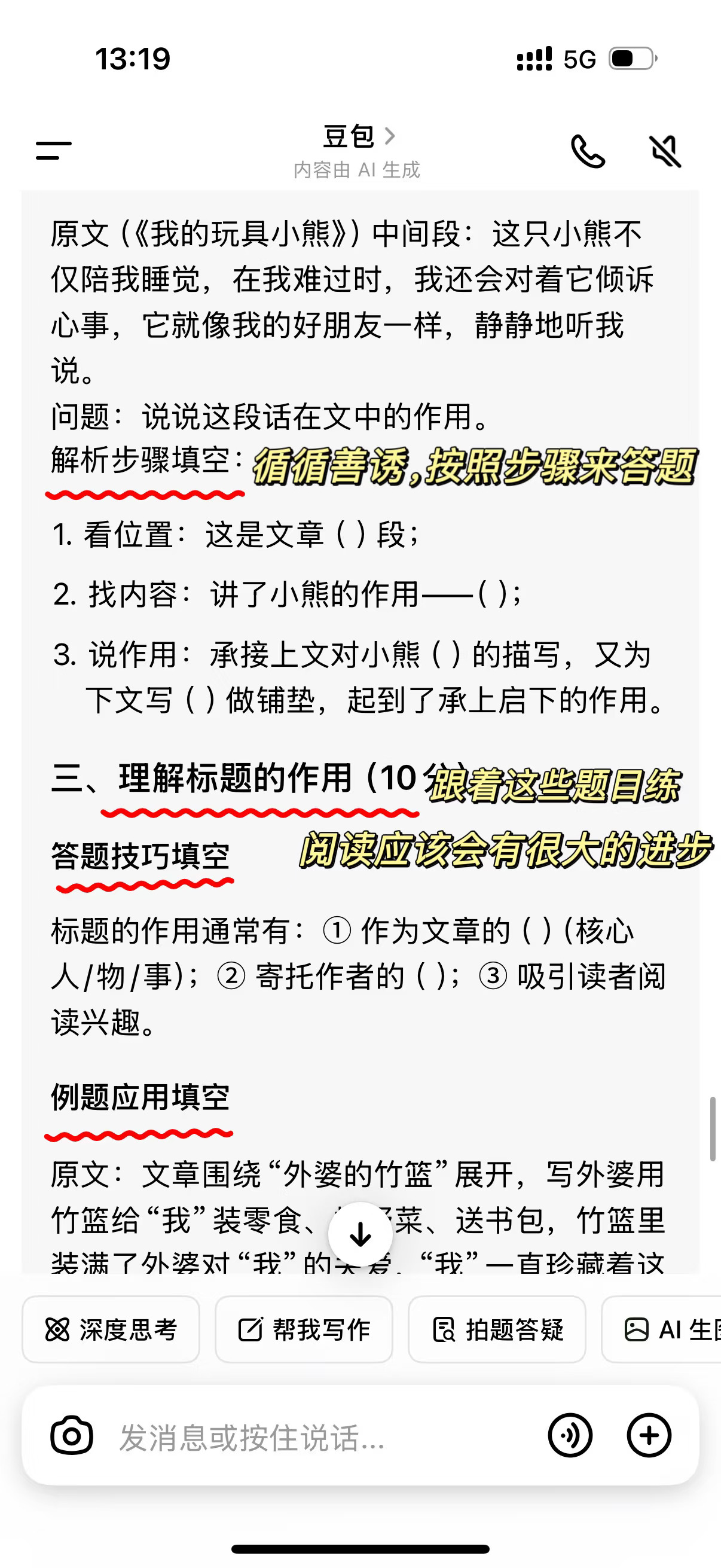 教小学中高年级语文的宝子们,谁懂整理阅读答题技巧的痛啊!😭真的太磨人了!因为前段时间我班好多孩子和我说答题没有思绪,不知道怎么抓重点,我就想着给他们整理一些阅读题的答题方法,不仅要理清“概括内容、段落作用、标题含义”这些高频考点,还要整理得通俗易懂,方便孩子理解和掌握。 昨晚我试着让豆包帮我整理阅读答题技巧,没想到它直接按6大核心题型分类,每类都配了小学生能秒懂的例题,还有一步步的解析步骤,语言直白易懂,也不用我怎么二次修改了。 题目还可以打印出来给学生当课堂练习,专项练习效率也高。 希望语文老师们都把更多精力放在课堂互动上,埋头整理资料这些很耗时间的事情就交给它去做吧!