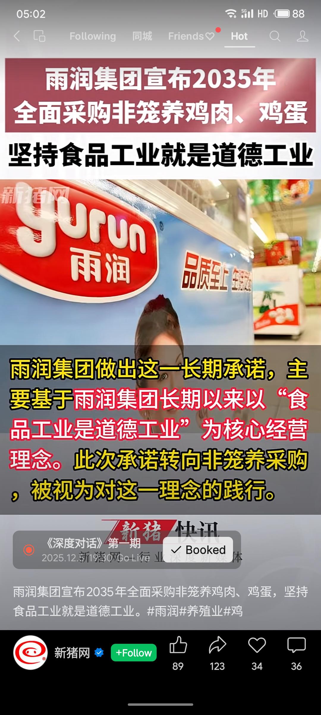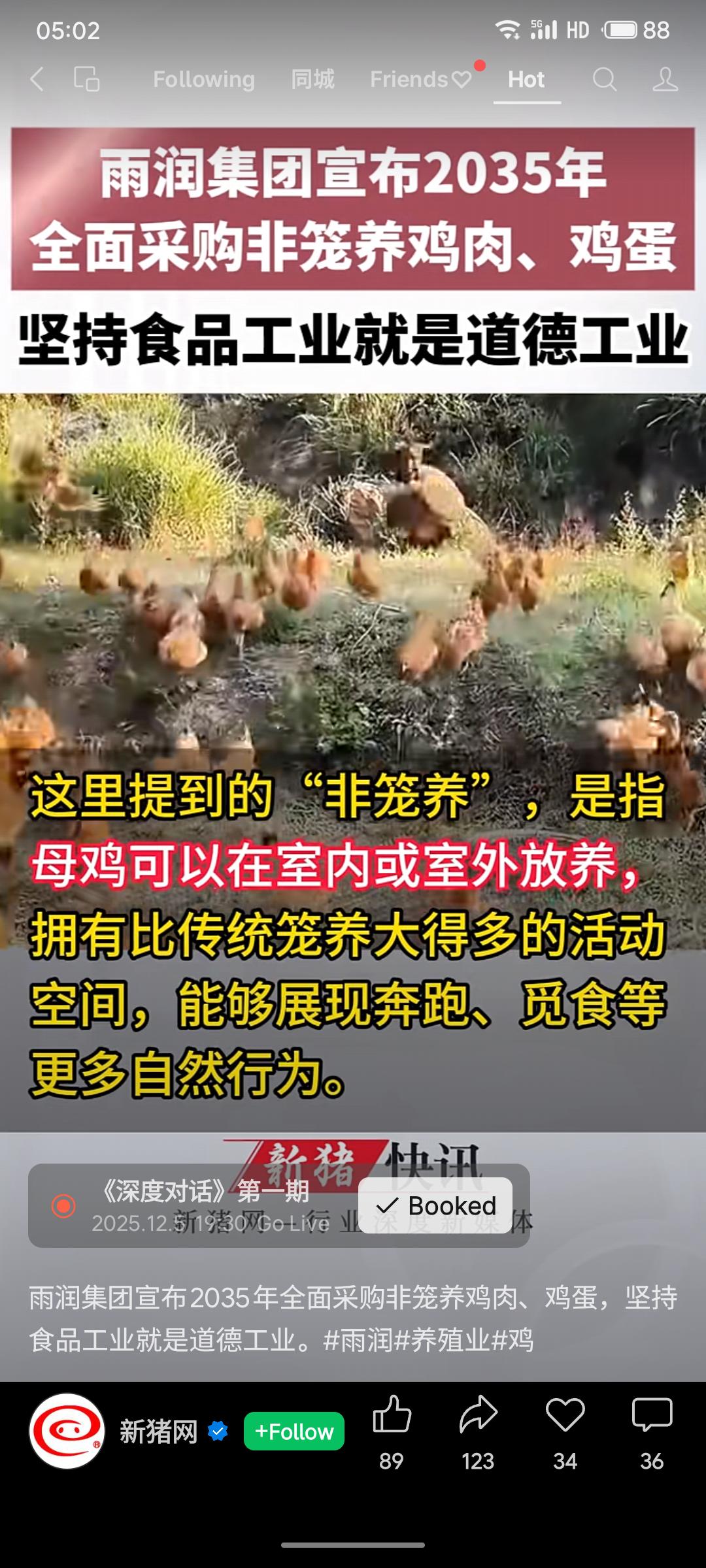 雨润集团宣布,基于“食品工业是道德工业”的理念,计划在2035年底前实现全球工厂全面采购非笼养鸡蛋和肉鸡。“非笼养”指母鸡拥有更大活动空间,能展现奔跑、觅食等自然行为。此举被视为对动物福利与可持续生产的长期承诺。