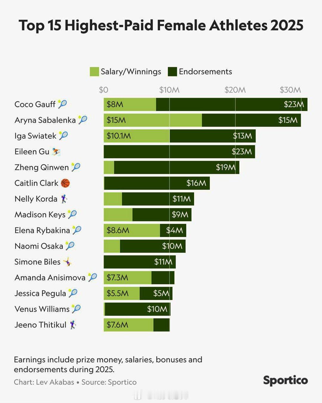 2025全球女子运动员收入排行网球选手在前十中占据七席高芙🇺🇸、萨巴伦卡🇧🇾、斯瓦泰克🇵🇱分列前三位,郑钦文🇨🇳排名第五,谷爱凌🇨🇳名列第四(非网球运动员第一)郑钦文全球女运动员收入榜第5女子选手收入榜网球霸榜