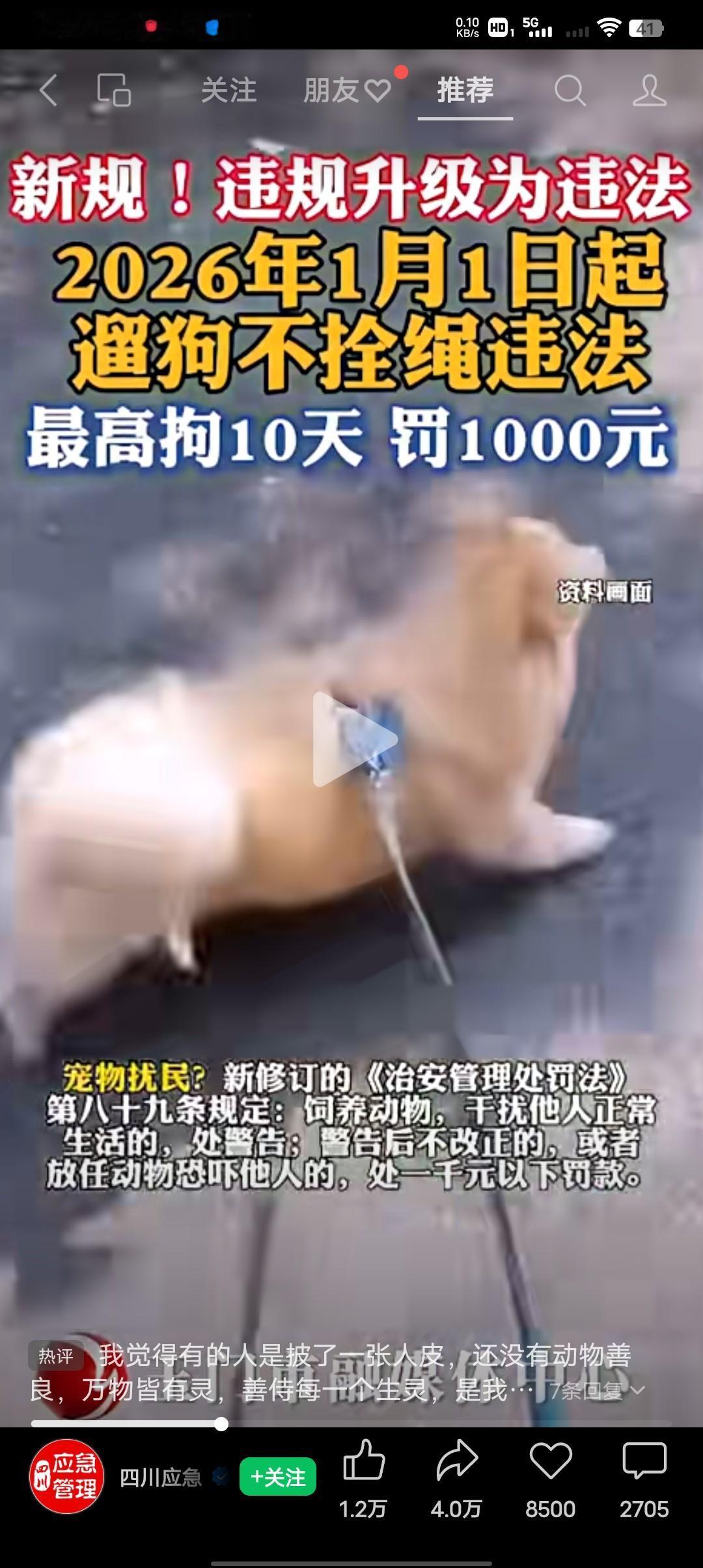 遛狗不拴绳,终于出新规了! 2026年1月1日起,新规,新规升级为违法,遛狗不拴绳违法,最高拘十天罚款1千元。这对一些养狗的人来说,也是起到一个一定的制约。 宠物扰民:新修订的(治安管理处罚法)第89条规定:饲养动物,干扰他人正常生活的,处警告,警告后不改正的,或者放任动物恐吓他人的,处一千元以下罚款。 就因为遛狗不栓绳,宠物狗咬伤了人,得纷争屡见不鲜。就应该对养宠物的人有一定的制约,保护到周围人的安全,小区里一些遛狗不拴绳,在经过他们的时候都小心翼翼的,生怕被狗给咬了!这下终于放心了,可以靠法律保护自己的人身安全了。