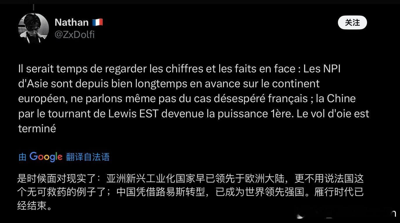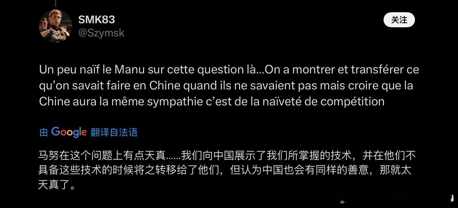 法国媒体刊文:“法国向中国寻求技术转让,原来我们才是所谓的新兴国家”。花了这么长时间才肯低下高贵的头颅看清现实,也不容易了。当然,评论区的法国人看不清现实的也不少。有叫嚣“经济惩罚让中国回报法国‘恩情’”的,有造谣“中国的技术都是西方给的”。事到如今还自欺欺人,无法接受自己早已不是世界中心的现实。也有很多法国网民的认知还是很清楚的,明白西方”一统天下“的旧时代早已过去,法国在科技经济各个领域已经逐渐落后,不是”新兴国家“而是”陈旧国家“了。人教人无用,事教人一教一个准。
