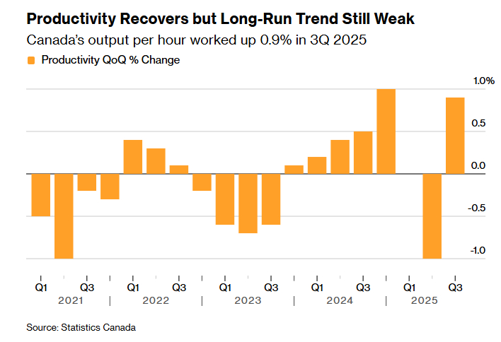 加拿大企业第三季度的单位劳动产出上升,几乎扭转了此前因与美国贸易冲突造成的生产率下滑。加拿大经济数据加拿大 加拿大统计局周三发布数据显示,加拿大企业第三季度劳动生产率上升0.9%,高于经济学家预期的0.5%,也是自去年底以来的最大增幅。统计局指出,这一增长“反映了在上一季度产出下滑后,企业产出的强劲复苏,而工时略有下降”。统计局近期还对过去几年的国内生产总值进行了上调,从而推高了产出估算。为海外华人提供有价值的信息与分析,更多内容和全文可在蓝天、电报、x查找causmoney,或直接谷歌搜索制造业、采矿业以及石油和天然气开采行业,是增长的主要动力。16个行业中有9个生产率上升。第三季度总工时下降0.1%。尽管季度数据超出预期,但自2021年初以来,加拿大的整体生产率几乎没有增长,过去十年的年均增速仅为0.6%,远低于美国。今年初,加拿大央行曾将低迷的生产率增长称为“危机”。提高单位劳动产出也成为新总理卡尼首次联邦预算案的核心内容,其中包括所谓的“生产率超级抵扣”,旨在刺激私人投资的税收激励机制。蒙特利尔银行首席经济学家道格·波特在一份致投资者的报告中表示,第三季度生产率的回升令人鼓舞,但更重要的是此前年份数据的大幅上修。他指出,2024年生产率增速从原先的0%上调至0.7%;2023年从-2.1%修正为-1.4%;2022年则从-0.6%上修至0.1%。“虽然没人会把加拿大视为全球生产率增长的领头羊,但眼下的情况远没有最初估计的那么糟糕,”波特表示。“毫无疑问,生产率依然是加拿大经济必须应对的基本问题,但从目前来看,政策制定者在多个方面确实开始进行修正,这是一个积极信号。”(彭博)