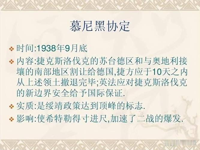 为了谋求和平,英国竟不惜牺牲他国利益,慕尼黑协定背后究竟隐藏着怎样的阴谋? 一战结束后,英国和德国都急于摆脱经济危机,然而德国却选择了战争之路,奥地利首当其冲成为其目标。紧接着,捷克斯洛伐克也成了希特勒觊觎的对象。英国首相张伯伦为避免战争爆发,决定牺牲捷克斯洛伐克以换取和平。他前往德国与希特勒会谈,可希特勒却漫天要价,要求吞并苏台德地区,还扬言不惜一战。张伯伦为了和平,勉强说服同僚,还拉上法国共同制定联合方案。 然而,希特勒并不知足,再次索要更多领土。张伯伦陷入两难境地,最终在法国的提议下,举行了慕尼黑会议。会议上,捷克斯洛伐克的部分领土被割让给德国,张伯伦以为就此换来了和平。但希特勒野心勃勃,他的目标是整个欧洲大陆。次年春天,希特勒出兵占领捷克斯洛伐克,慕尼黑阴谋彻底败露,张伯伦沦为众矢之的。 慕尼黑协定的真相令人震惊,你觉得张伯伦的做法是对是错?快来评论区发表你的看法吧!慕尼黑协议 慕尼黑