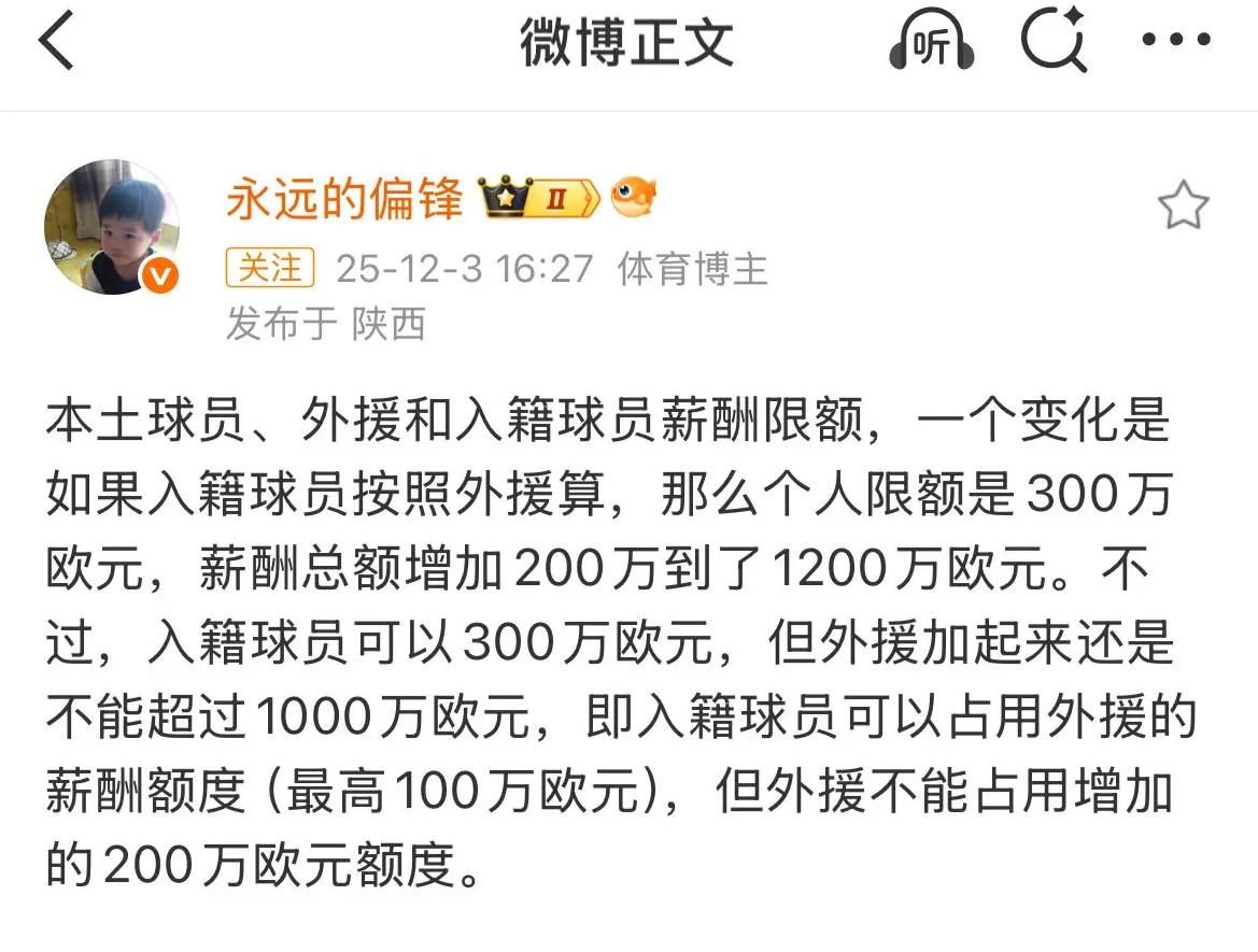 中超新政策变换:归化球员薪资若超过 200万欧,超过部分将占用外援工资帽! 今年中超薪资的政策,和往年基本差不多,但是归化球员方面,政策有调整。就是归化球员可以按照外援薪水发放,但是在总1000万欧的基础上,只增加200万欧,就是归化球员加外援总薪资是不超过1200万欧,但是外援总封顶就是1000万欧。 比如一个归化球员薪水是100万欧,那么外援总薪资还是1000万,要是这个归化球员薪水是300万欧,那么外援总薪资就是900万欧,以此类推! 不过,归化球员薪资超过200万欧的,恐怕就只有一人吧,当初他合同是从恒大平移过去的。
