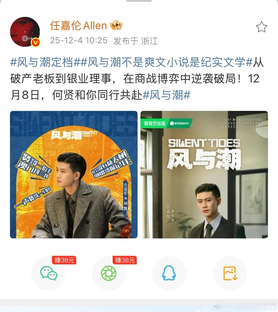 风与潮定档风与潮不是爽文都是自传 任嘉伦亲自宣布定档:从破产老板到银业理事,在商战博弈中逆袭破局!12月8日,何贤和大家一起共赴风潮!
