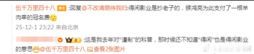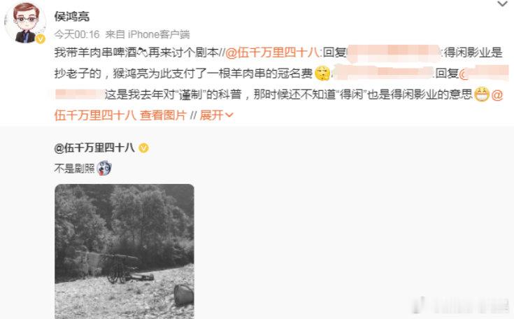 侯鸿亮兰晓龙互动侯鸿亮回应兰晓龙 12月1日,《得闲谨制》编剧兰晓龙回复网友“‘得闲’也是得闲影业的意思”的评论,表示:“得闲影业是抄老子的,猴鸿亮为此支付了一根羊肉串的冠名费”12月4日,转发回应:“我带羊肉串啤酒🍻再来讨个剧本。”两位蛮有意思的哈哈哈!