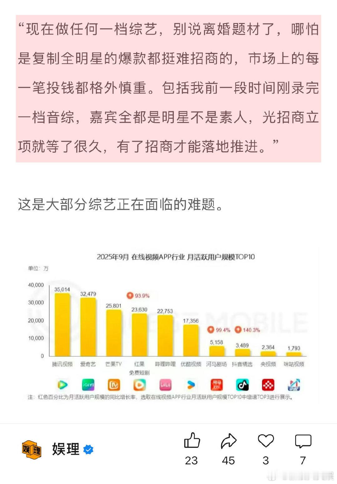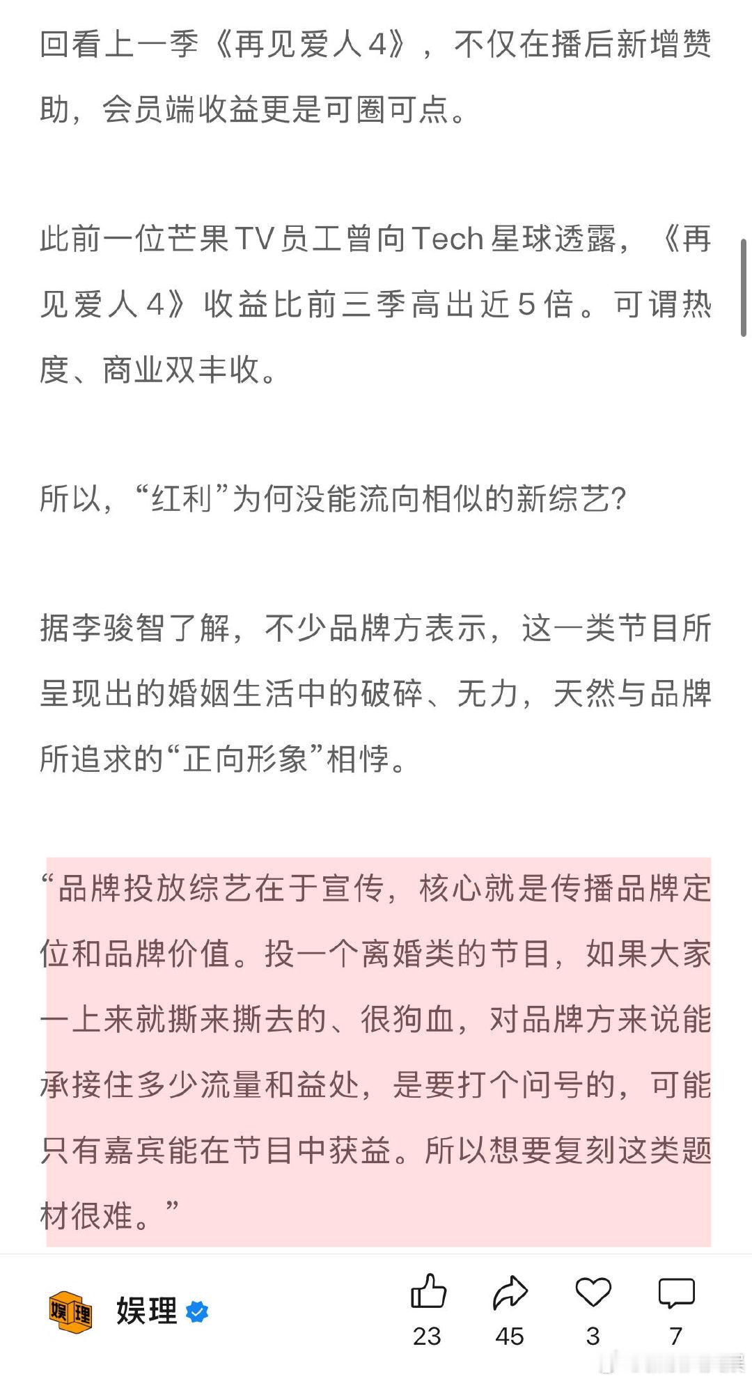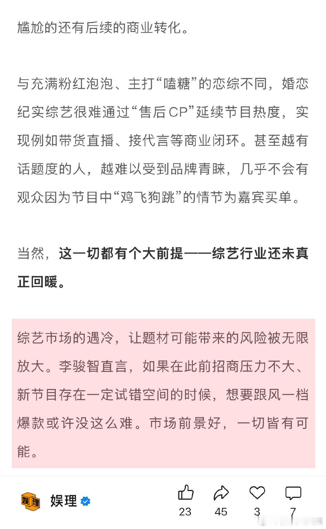 品牌方觉得离婚这事儿晦气 业内谈离婚综艺招商难 综艺市场的遇冷,让题材可能带来的风险被无限放大。业内李骏智直言,如果在此前招商压力不大、新节目存在一定试错空间的时候,想要跟风一档爆款或许没这么难。市场前景好,一切皆有可能。“现在做任何一档综艺,别说离婚题材了,哪怕是复制全明星的爆款都挺难招商的,市场上的每一笔投钱都格外慎重…”娱理独家↓