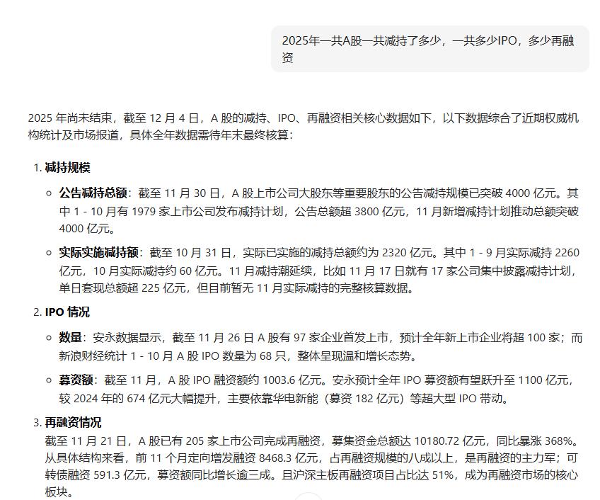 今天我问豆包三个问题, 2025年一共A股一共减持了多少,一共多少IPO,多少再融资 截至 11 月 30 日,A 股上市公司大股东等重要股东的公告减持规模已突破 4000 亿元。 已经实施的2320亿元。 IPO到现在是97家左右,截至 11 月,A 股 IPO 融资额约 1003.6 亿元 A 股已有 205 家上市公司完成再融资,募集资金总额达 10180.72 亿元,同比暴涨 368% 那么A股这减持数是高是低呢? 我们对比一下美股,美股中结合 2025 年各大上市公司控股股东、核心高管及顶级机构股东的减持动作,可梳理出重点主体的减持规模,汇总后关键减持金额已超 260 亿美元,注意这其中有130亿美元是巴菲特减持的。真正公告的上市公司高管减持的,可能也就130亿美左右。到目前为止不到1000亿。美股的总规模大概是 A 股的 4.1 倍,减持不到A股的四分之一。 A股中有的个人控股能达到50%以上。面对几十倍的PE,他人减持一点点,本就回去了。 在美股中想减持,不是那么容易的 比如关联方每 3 个月减持量不得超过公司流通股总数的 1% 或过去 4 周平均周成交量的较高值;内部人买入后 6 个月内卖出股票的所得利润需返还公司, 且每次交易后 2 个工作日内就要披露交易细节。 意思就是我先公告,你们觉得不好,可以先走,然后我殿后。 防止大股东偷溜才能让A股投资者信心倍增。。。