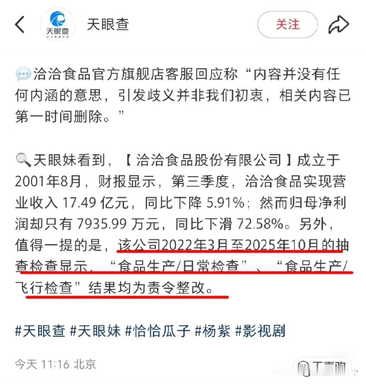 不出意外,意外还是发生了 杨紫的粉丝又和别人掐起来了,这次不是迪丽热巴家,而是和恰恰瓜子! 起因是云合数据因为注水严重,被各家粉丝叫成“水合”逐渐演变成三点水+合的“洽洽”。 罗云熙粉丝说杨紫的《国色芳华》注水,给她取名“洽洽瓜紫”。 本来是两家粉丝的争端,没想到洽洽瓜子官方也玩梗,还说“洽洽瓜子”不等以“洽洽瓜紫”,自己的瓜子没有多余水分。 这下杨紫粉丝不干了,开始扒洽洽的黑料,偏偏洽洽瓜子自己也问题一堆,根本经不住扒。 被扒出存在严重的食品安全问题,22年开始每年抽检都不合格,年年被要求整改,年年有问题。 粉丝撕架变成安全问题。