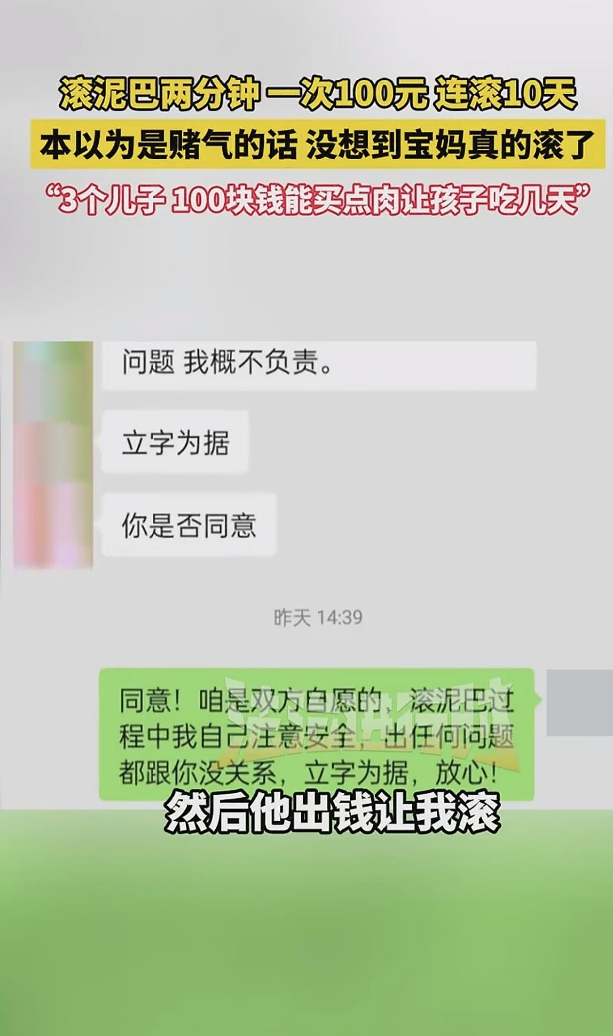 河北邢台,一女子生了个儿子,2胎双胞胎又是儿子,她看视频,有个大哥在滚泥巴,就在视频下面评论:如果有人愿意给我100元,我也滚泥巴。万万没想到,有个男子联系她,说他出钱让女子滚泥巴,滚泥巴10天,每天2分钟,给女子1000元,不料,女子竟然毫不犹豫的答应了,两人立帖为证,女子:100块钱买肉能让我3个儿子吃几天,男子彻底傻眼了。结局出乎意料。 一女子婚后生了个儿子,一家人沉浸在添人进口的欢天喜地里,在农村,第一胎生了个儿子,对于整个家庭来说是件大喜事。 可万万没想到,女子生了二胎,不但还是儿子,竟然还是双胞胎儿子,这可把一家人愁坏了,顿觉压力山大。 众所周知,3孩家庭,把孩子从小养大,不但耗费精力心血,还要花很多钱,他们还要上幼儿园,小学,中学,高中,大学,毕业了还要娶妻生子,父母还要准备房子,彩礼……花钱的日子无休无止,当父母的想想就头大。 可既然孩子生下来了,做父母的就要承担为人父母的责任,让孩子吃好穿暖,接受良好教育,将来学有所成光宗耀祖。 于是,女子的老公起早贪黑在外面挣钱,女子则在家安心照顾3个儿子,一日三餐无微不至,夫妻俩分工明确,但目标一致,把日子过好,让孩子们平安健康,幸福的长大。 这天,女子看视频,一大叔在滚泥巴,女子看后哑然失笑,就在视频下评论,内容是,如果有人给她100元,她也在地上滚泥巴。 这本是一句玩笑话,可有个男子竟然较真起来,他私信女子,说他出钱,让女子在泥塘里滚10天泥巴,一天2分钟100元,要像视频里那个大叔那样,不打折扣滚泥巴2分钟,视频从开始就拍,拍够2分钟结束,但这个过程中,出了问题受了伤,男子概不负责,立帖为证。 不料,女子当即同意,在她看来,男子没有恶意,而这对她来说,是个挣钱的好机会,10天能挣1000元,100元买一大块肉,就够3个儿子吃好几天了,自己又没啥损失,何乐而不为呢? 至于尊严,那都无所谓,面子能值多少钱?他她也没做损人利己的事,那也是凭本事挣钱,弄脏了回家洗洗就好了,这有啥呢? 于是,女子爽快的答应了,并跟男子承诺,这是他们双方自愿的,滚泥巴时她会注意安全,放心,出了问题绝不追究男子的责任,立贴为证。 这回轮到男子目瞪口呆了,他说啥都不会想到,女子竟然是认真的,但男子觉得,自己一个大男人,必须言而有信,绝不能反悔。 就这样,女子每天滚泥巴2分钟,虽然泥沟很脏,但她眼睛一闭就滚动起来,一点都不耍滑头,任凭自己一身脏污,但她得说到做到,得有契约精神。 而男子也言出必行,支付了女子1000元,他们的行为,不管娱乐了谁,但两人都恪守承诺。 对于自己的这段经历,女子没有生男子的气,她也不是被架在那里,不做不行,而是确实想挣这笔钱,给3个儿子改善生活,帮丈夫分担经济压力。 有人看了很感动,想帮女子一把,想联系这个母亲,一天100块,连续30天,每天跑步5分钟,这样既锻炼了她的身体,也能让她挣到钱。 不管调侃还是什么,人家真给钱了,宝妈也真的足时的打滚了,双方都说话算话,无可指责。两位我都敬佩,佩服大哥的言而有信,佩服大姐的母爱如山。 这很好呀,一个愿意滚泥巴,一个愿意给钱 当有钱人真心想帮人时,不一定要给,而是要让需要钱的人,自己挣到钱,这样的善意才是不是最大的福报。 心甘情愿。一个愿打一个愿挨。都是为了自己的私欲。又不影响别人。希望不要去指责这个行为。只能说当全职妈妈不容易。应该多关注这种家庭,让所有人都富裕起来。 《民法典》第143条规定:具备下列条件的民事法律行为有效:(一)行为人具有相应的民事行为能力;(二)意思表示真实;(三)不违反法律、行政法规的强制性规定,不违背公序良俗。 女子与男子都是完全民事行为能力人,成年且精神正常,可独立订立协议。 女子主动评论“愿为100元滚泥巴”,后明确同意协议“爽快答应”“立帖为证”;男子提出要约支付1000元换取10天滚泥巴,女子承诺,双方意思表示一致。 协议内容为劳务服务,滚泥巴表演换取报酬,没违反法律强制性规定;虽涉及人身安全免责条款“受伤概不负责”,但不构成《民法典》第506条规定的“造成对方人身损害”的无效免责情形,因该条款仅针对故意或重大过失造成损害,而协议本身没要求男子提供安全保障措施。 《民法典》第8条:民事主体从事民事活动不得违背公序良俗。 本案中,女子为改善子女生活自愿履约,男子支付合理报酬,没涉及侮辱、欺诈或剥削,不违背公序良俗。 双方劳务合同符合《民法典》第143条要件,男子支付报酬、女子履行义务的行为受法律保护。 人身损害免责条款因违反《民法典》第506条无效,但其他条款,如支付报酬仍有效。 此类活动存在人身安全隐患,组织者应尽到安全提醒义务,否则可能承担侵权责任。 关注@灋律盐究员 学法辩是非,用法止纷争。