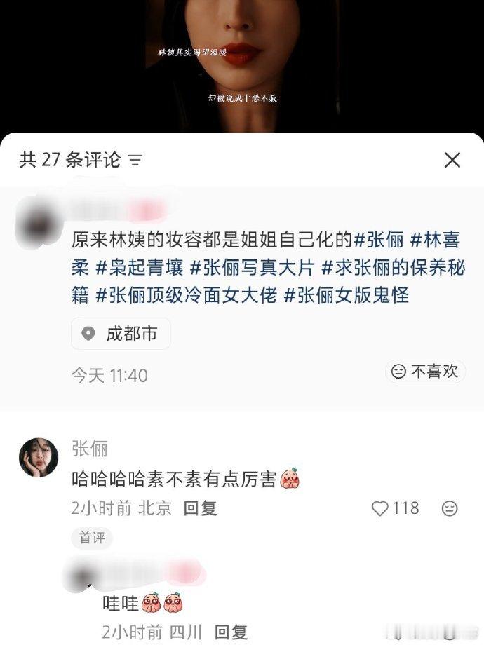 张俪枭起青壤妆容是自己化的林姨的妆容是张俪自己化的 看到消息直接震惊!张俪在线回复网友 “素不素有点厉害”,哪里是有点厉害,明明是超级厉害,手巧程度绝了~张俪外网评价