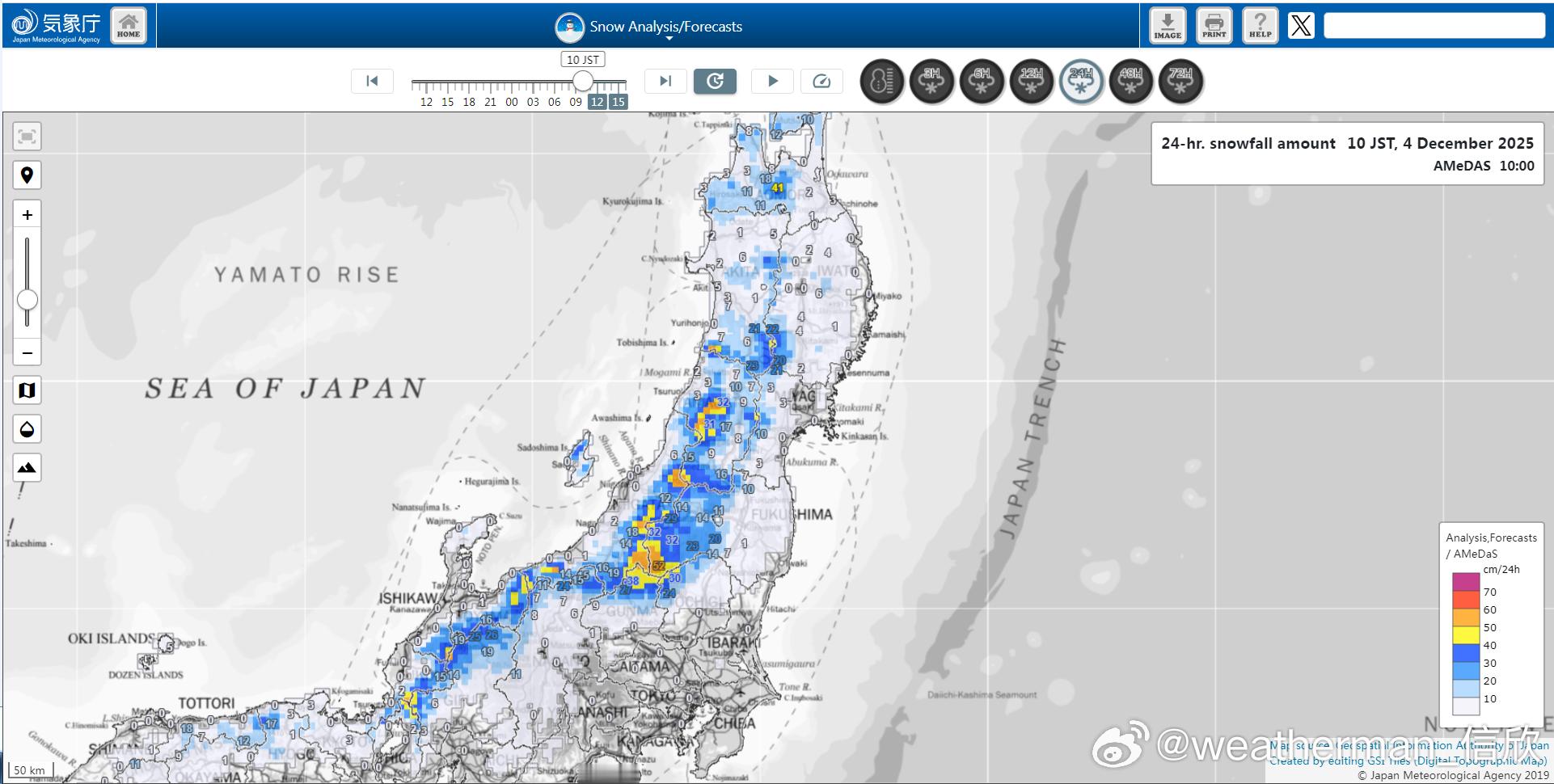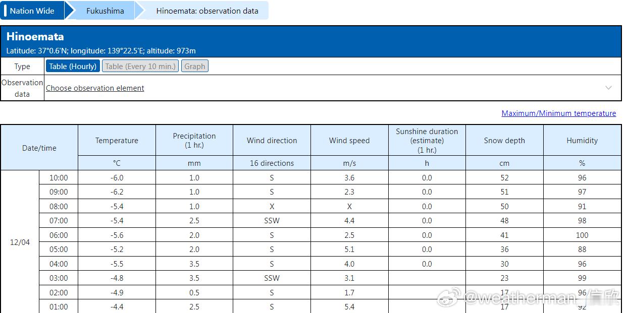 【冷流降雪】近期冷空气东移,经过日本海加湿,也导致日本出现了明显的冷流降雪。北京时间今天9时(当地10时),桧枝岐(Hinoemata)的积雪达到了52厘米。