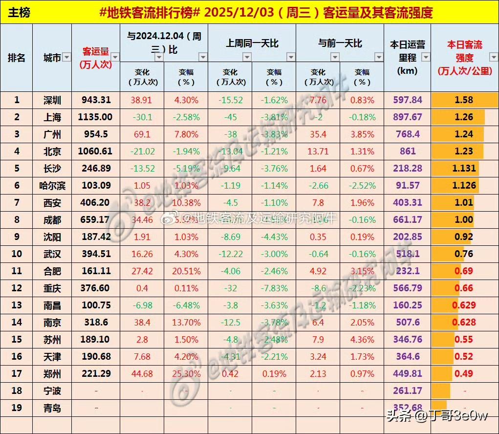 南昌地铁客流量周三刚过百万人次,位居排行榜榜尾。[呲牙][呲牙][呲牙] 爆料 身边事 排行榜 周三 南昌地铁 中国地铁客流日报 地铁客流排行榜 昨日客流 12月3日(星期三) 全国地铁客流量排行榜: 上海1135.0万 北京1060.61万 广州954.50万 广州地铁 深圳943.31万深圳地铁 成都659.17万 西安406.20万西安爆料 武汉394.51万武汉地铁 重庆376.60万重庆身边事 南京318.60万南京地铁 长沙246.89万 郑州221.29万郑州爆料 天津190.68万天津身边事 苏州189.10万苏州地铁 沈阳187.42万 合肥161.11万合肥爆料 青岛100万+青岛身边事 宁波100万+宁波地铁 哈尔滨103.09万 南昌100.75万