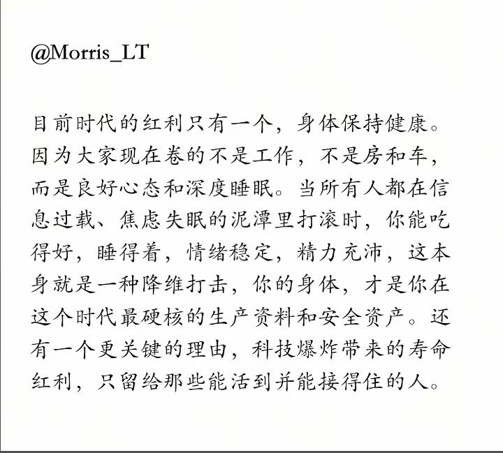 说得很对。在当下,真正的红利只有一个,就是保持身体健康。