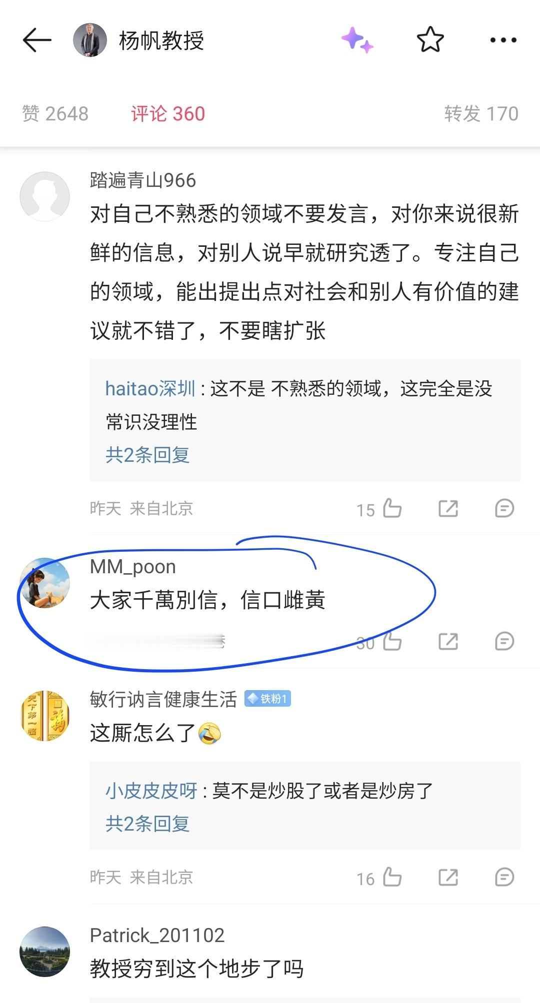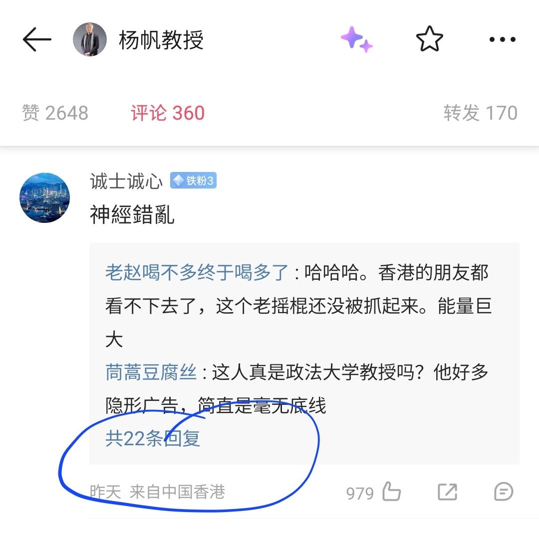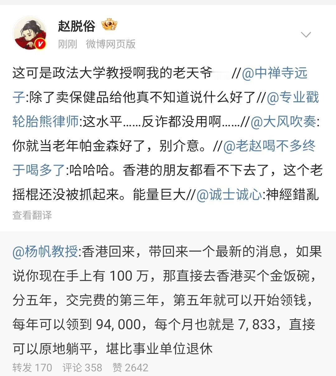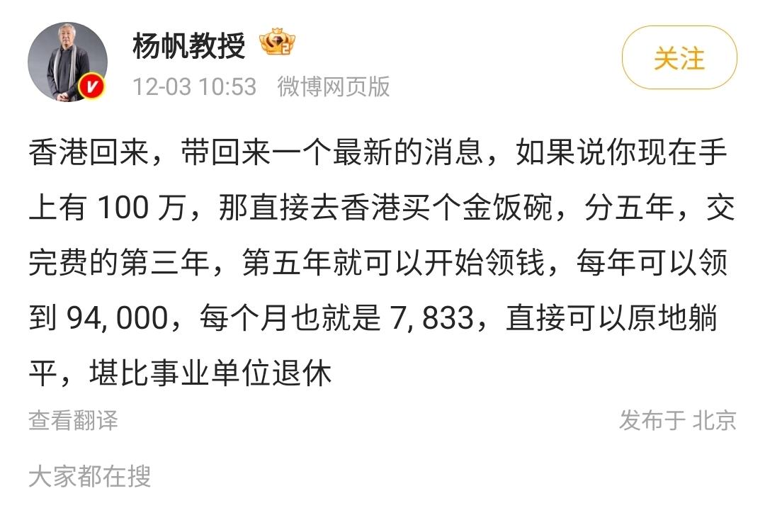 中国政法大学杨帆教授在网上说话也没个把门的。 直接说什么在香港如果有100万,就可以买一个金饭碗,然后每年可以领9万多,堪比事业单位退休。 评论区里不少香港IP的网友都在跳着脚骂街,说这个老头胡言乱语,神经错乱,根本没有的事。 咱就说杨帆老哥怎么也是个政法大学的教授。 怎么思想境界和认知,感觉还不如普通老百姓啊。 他知道自己在说什么吗? 或者说,他上课的时候,有这么教育自己的学生吗?