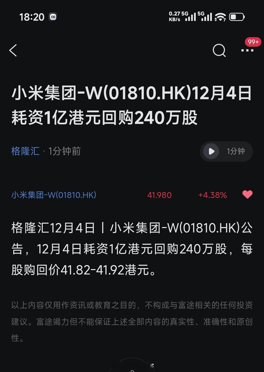 【米东快讯】今日回购 1 个亿小米集团-W(01810.HK)公告,12月4日耗资1亿港元回购240万股,每股购回价41.82-41.92港元。