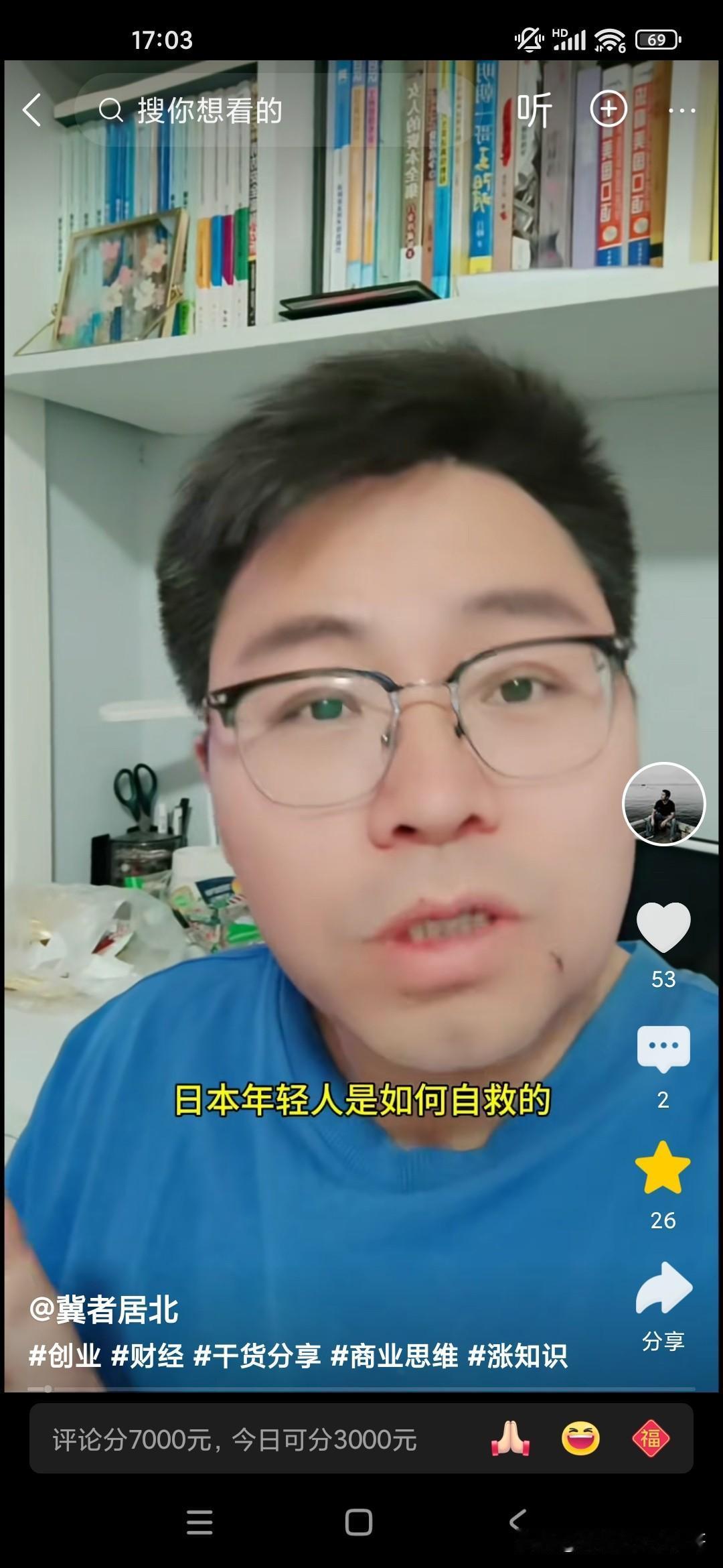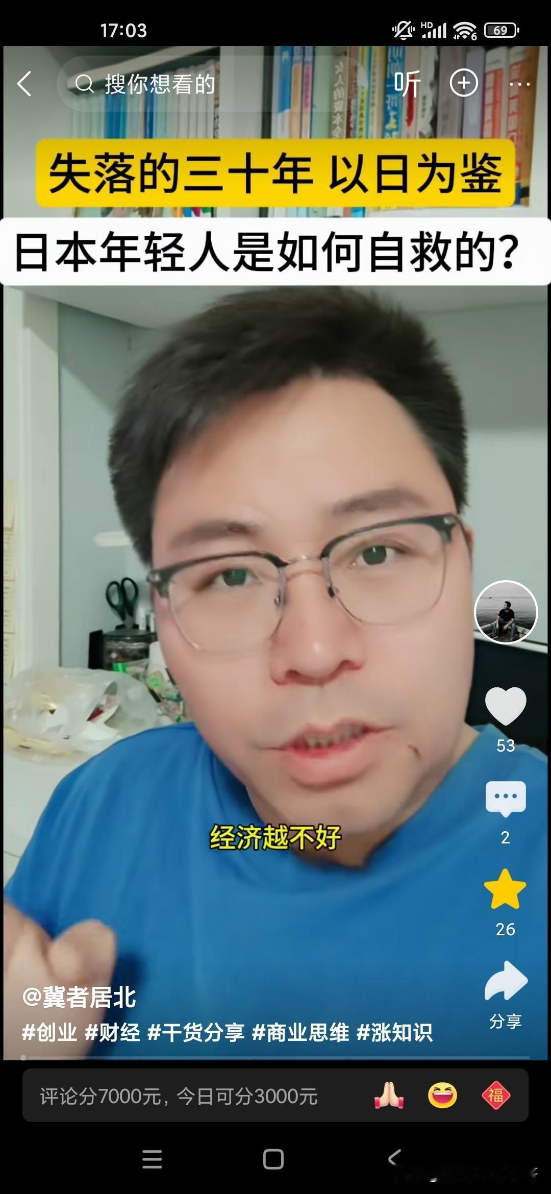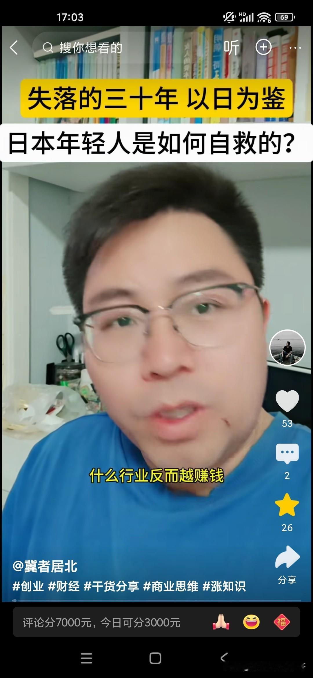 这个经济专家就是说现在我们国家面临的情况呀,跟日本30年泡沫差不多,日本年轻人是怎么自救的?我们做一些中国的失业青年的,或者说处于人生低估的青年的,可以从中吸取一些教训,第一就是发展副业,除了主业之外发展副业;第二的话是要有多种技能,不要有单一技能,当寒冬来临的时候,单一技能的人非常容易被淘汰;第三的话是开始了独居生活,开始了深居简出,不该消费的不消费,开始回归理性;第四的话是保重好,身体健康永远是第一位!