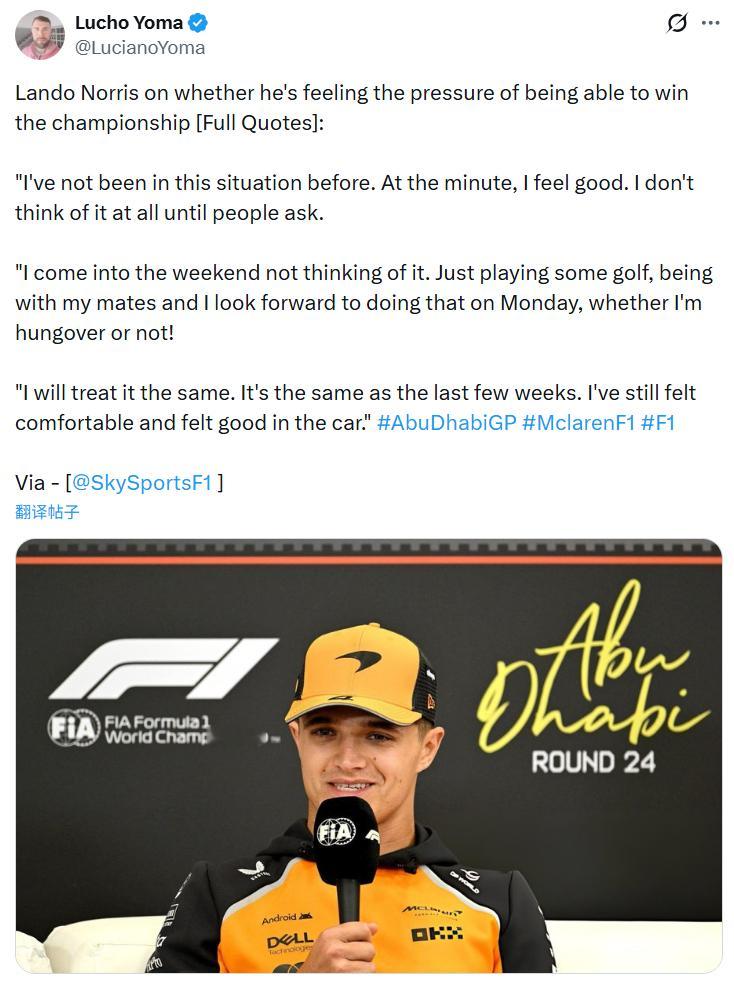 诺里斯谈及是否感受到争夺世界冠军压力时说道:“我之前从未遇到过这种情况。此刻,我感觉很好。直到被别人问起,我才想起来。”“我来到这一周末没有去考虑这些。就是打打高尔夫,跟我的朋友们在一起。我期待着周一也做这样的事情,无论我是否宿醉。”“我将会同等对待,这与过去几周是一样的。我仍然感觉很舒服,在赛车感觉很不错。”2025f1阿布扎比大奖赛