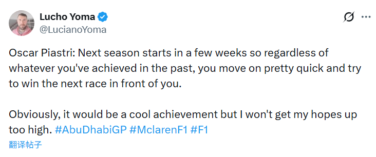 皮亚斯特里:“下赛季将在几周之后开始,所以无论你在过去取得了怎样的成绩,都需要很快翻篇,并尝试赢下你眼前的下一场赛事。显然,这(世界冠军)将是一个很酷的成就,但是我不会报太高的期望。”2025f1阿布扎比大奖赛