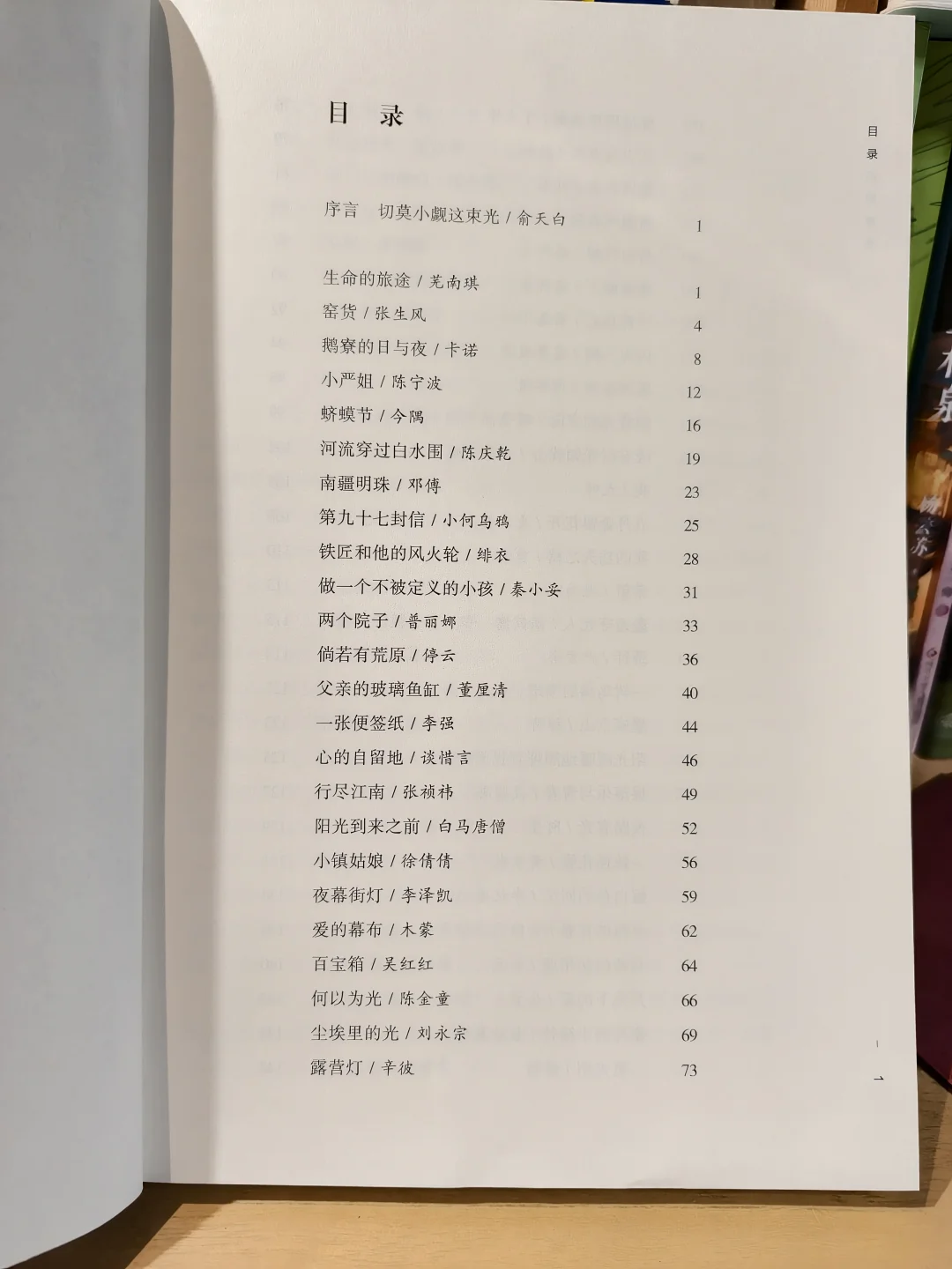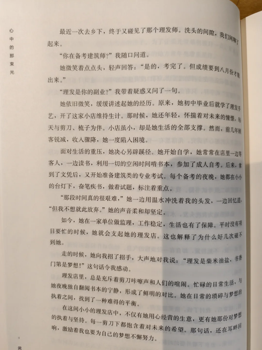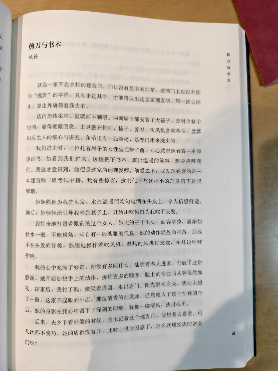 前两天收到《心中的那束光》作品合集。太惊艳了!不管是封面和内页都非常有质感。我的一篇散文《剪刀与书本》也收录在其中。 . 虽然只是合集,但对我而言也是莫大的鼓励,鼓励我坚持不断地写。今年是我写作的第4年,已经写了30万字,发表了几十篇文章。今年把写作重点放在了儿童文学上,但同时也继续在写散文~ . 说起这篇文章《剪刀与书本》,还有一个小故事呢。去年,我去乡下外婆家,去了开在村里的这个理发店,和理发师闲聊时,她告诉我,她还在读书考证。对于她而言,开理发店是维持生计,而她真正想做的职业是建筑师。 . 当时听了她的故事很受触动,回来就写了一篇文章。 后来在上看到:预见文化的征稿,便修改投稿了。从投稿到出版,拿到书,大概一年半的时间,已经很快了! . 作为一个从零开始的写作者,想跟大家分享一些实用的心得: 1⃣是宝藏平台,主动出击多投稿 上的征稿机会真的超级多!关注各大出版社、文化公司的账号,他们经常发布征稿信息。善待你写的每一篇文章,哪怕是日常随笔,都有可能成为投稿素材。我就是在刷时偶然看到预见文化的征稿,才有了这次出书机会! 2⃣随时记录生活,灵感就在身边 那个理发师的故事如果我当时没记录下来,可能早就忘了。现在我随身带个小本子,手机备忘录也随时开着。一句话、一个表情、一个细节,都可能成为绝佳的写作素材。生活处处是故事,关键在于有没有发现的眼睛。 . 3⃣建立自己的素材库,定期整理很重要,否则记录再多也找不到。(后面会写一篇如何建立素材库的笔记) . 4⃣坚持写作训练。写作就像肌肉训练,不练就会退化。我不是每天写,我是每5天写一篇文章。 . 5⃣ 多读优秀作品,模仿中找到自己的风格 我每个月至少读5本书,涵盖散文、小说儿童文学等不同体裁。读的时候不只是看内容,更要分析作者的写作技巧、结构安排、语言风格。好的作品就是最好的写作老师,在模仿中慢慢形成自己的风格。 . 🌈 写在最后的话 从那个在理发店听故事的我,到现在拿着出版作品的我,这一年半的时间里最大的感悟就是:永远不要小看生活中的每一个瞬间,也不要低估自己的文字力量。 . [偷笑R]每个人心中都有一束光,而写作,就是把这束光分享给更多人的方式。愿我们都能在文字的世界里,既做那个寻光的人,也做那个发光的人~ . 👧我是纯粹,自由撰稿人,儿童文学爱好者。 梦想出版属于自己的散文集和童话故事集