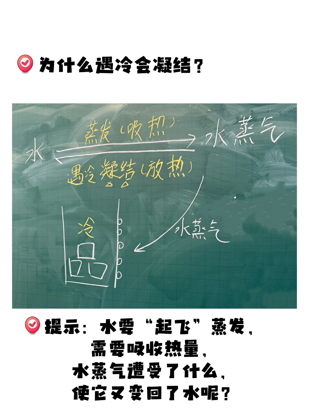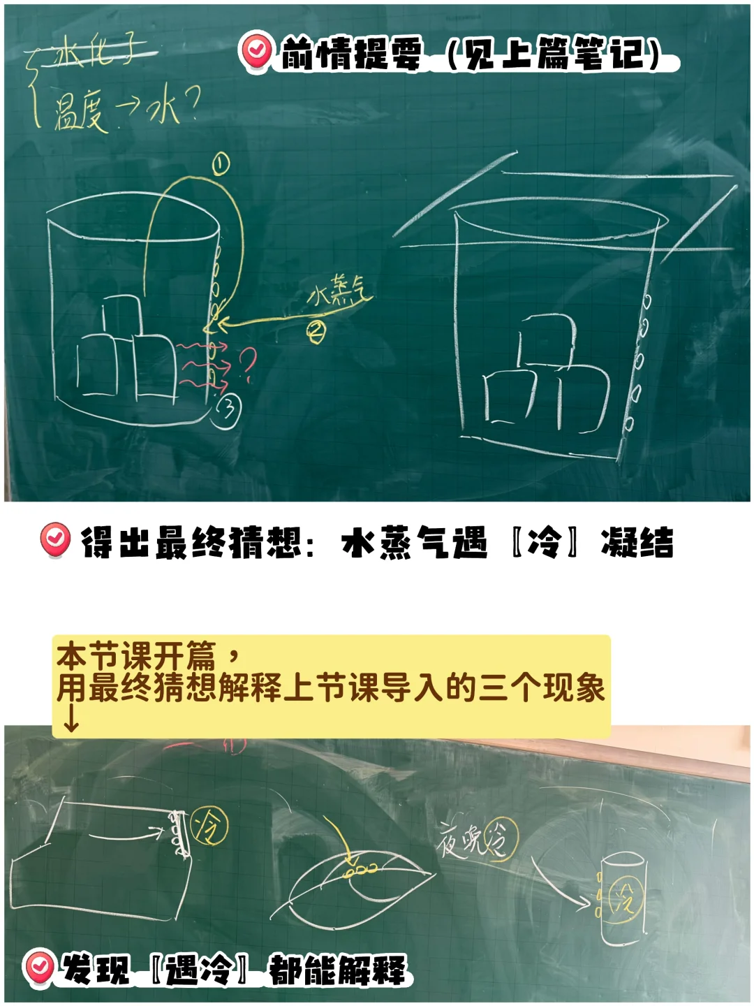 这个环节很有意思!学生用“遇冷凝结”成功解释了所有前一课留下的疑问以后,突然【被推翻】