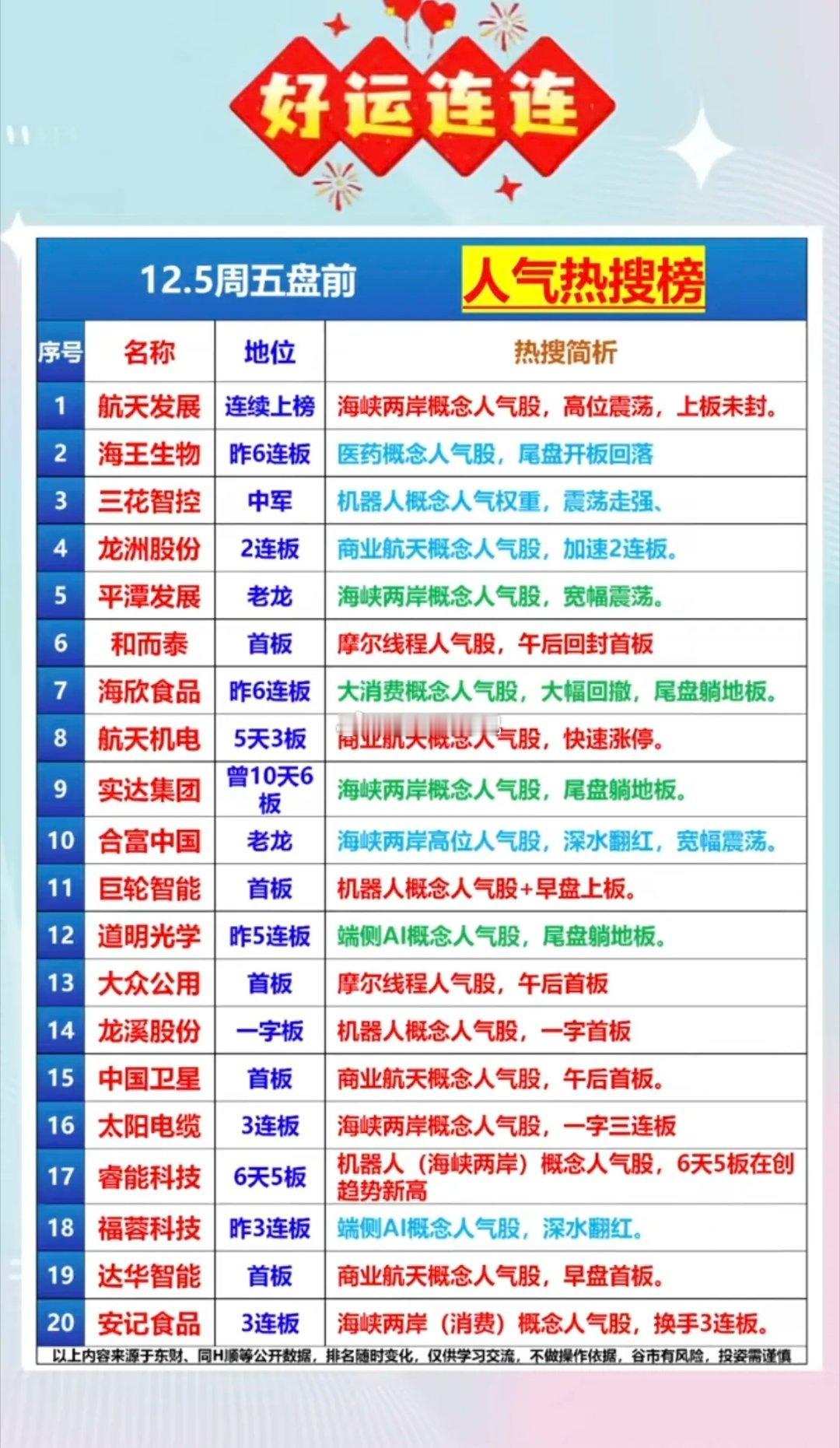 12.5周五盘前 人气热搜榜!1.航天发展:海峡两岸,震荡上板未封。 2.海王生物:昨6连板 医药,尾盘开板3.三花智控:机器人,震荡走强4.龙洲股份:2连板 商业航天,加速2连板5.平潭发展:老龙 海峡两岸,震荡。 6.和而泰:首板摩尔线程,午后回封7.海欣食品:昨6连板 大消费 回撤地板。 8.航天机电:5天3板 商业航天,涨停。 9.实达集团:海峡两岸,尾盘躺地板10.合富中国:老龙海峡两岸,深水翻红