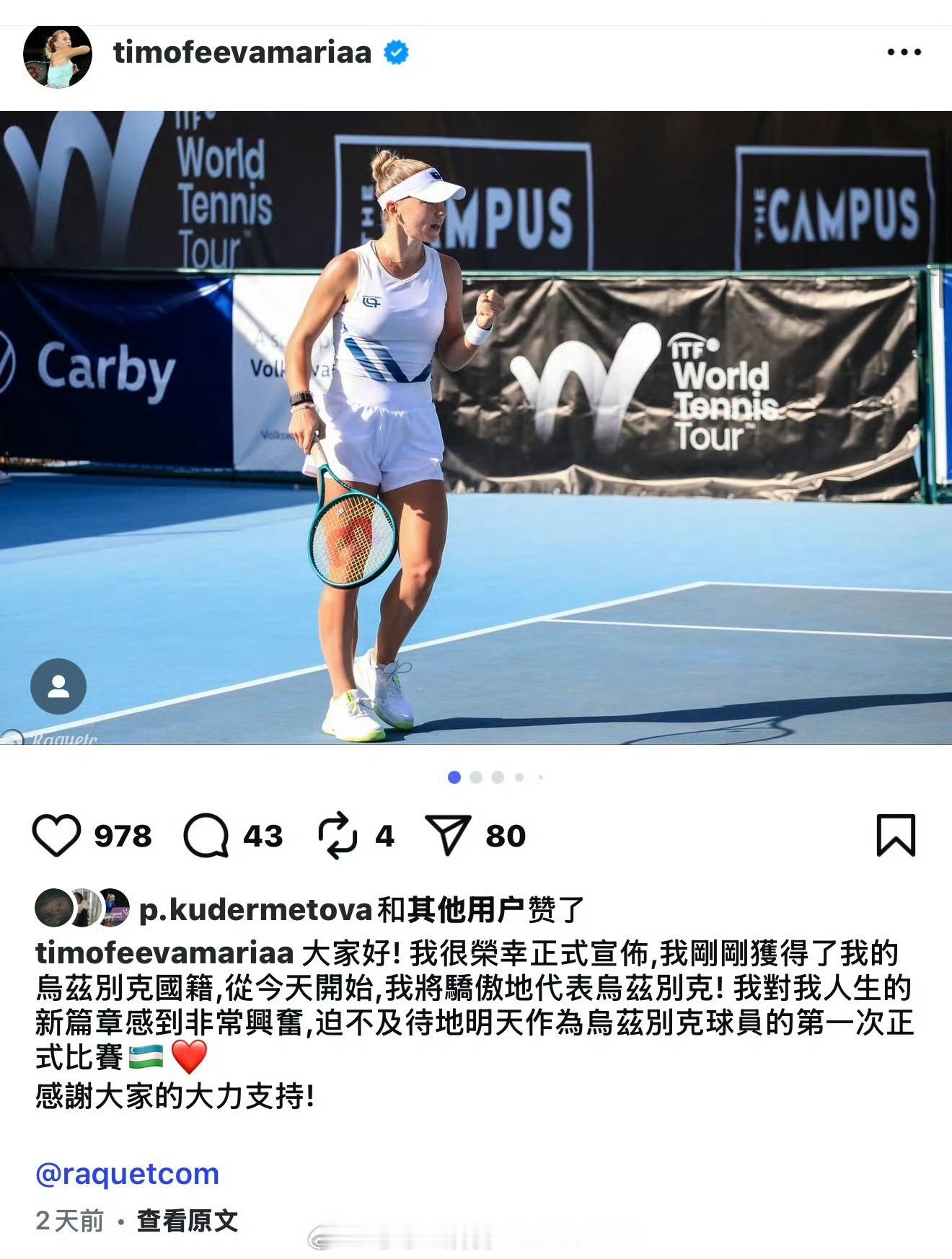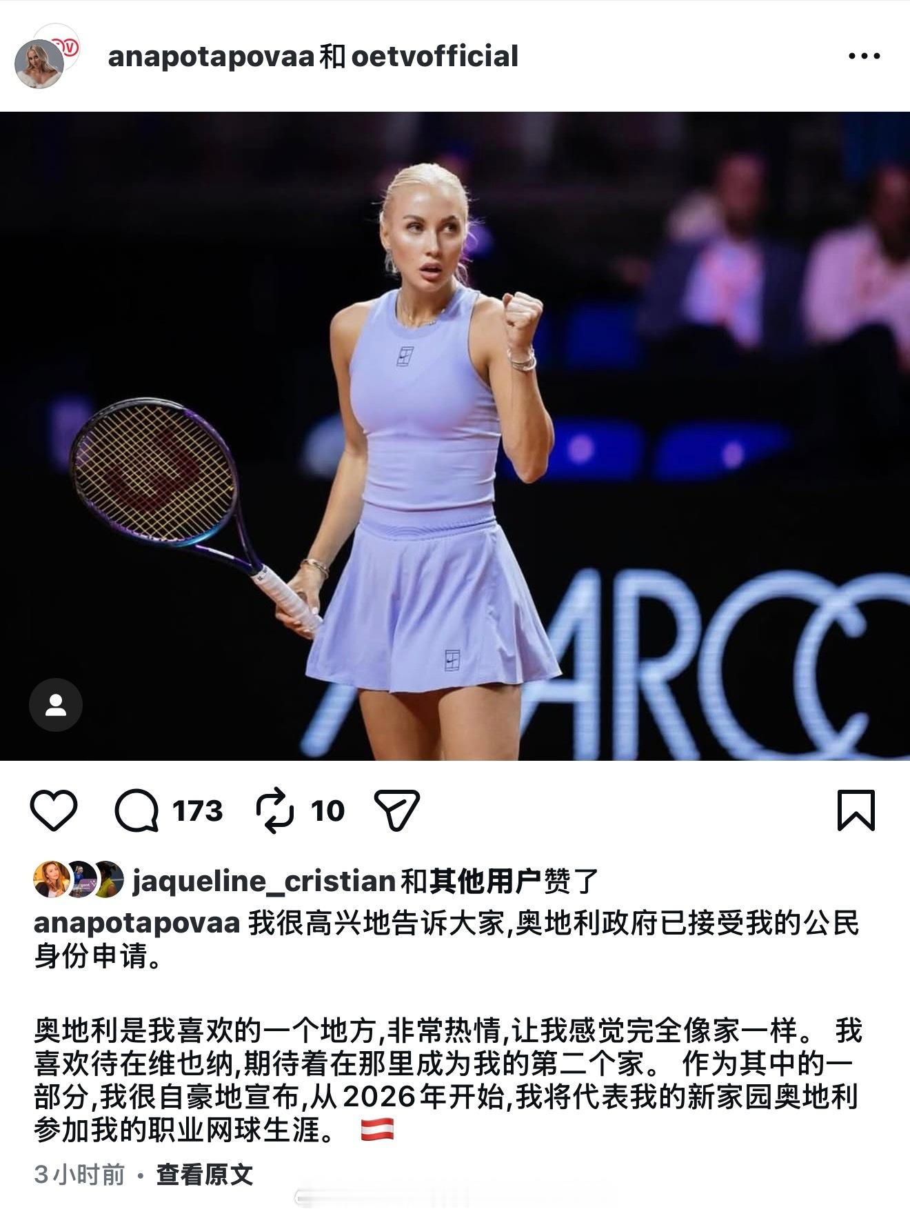 波塔波娃➡️奥地利🇦🇹拉希莫娃➡️乌兹别克斯坦🇺🇿季莫费耶娃➡️乌兹别克斯坦🇺🇿卡萨金娜➡️澳大利亚🇦🇺阿瓦涅相➡️亚美尼亚🇦🇲舍夫琴科➡️哈萨克斯坦🇰🇿格拉乔娃➡️法国🇫🇷此前俄罗斯网协主席就表示会有更多人正在转籍中。以后应该还会有公布的球员,且等着吧!祝福这些球员们。 多名俄罗斯网球选手转国籍