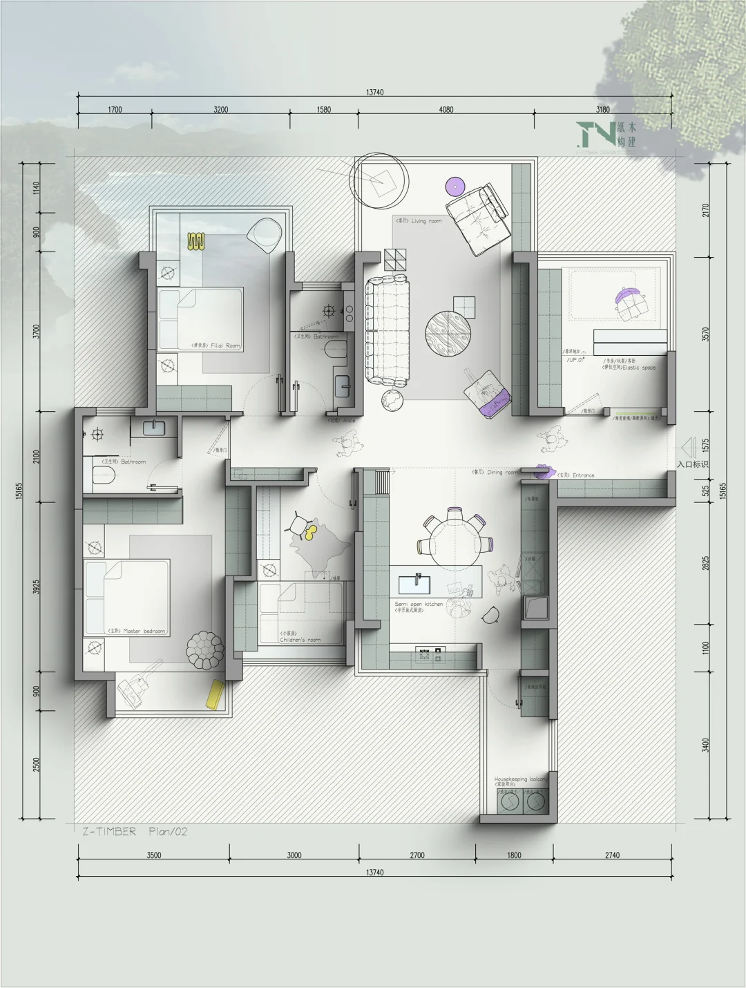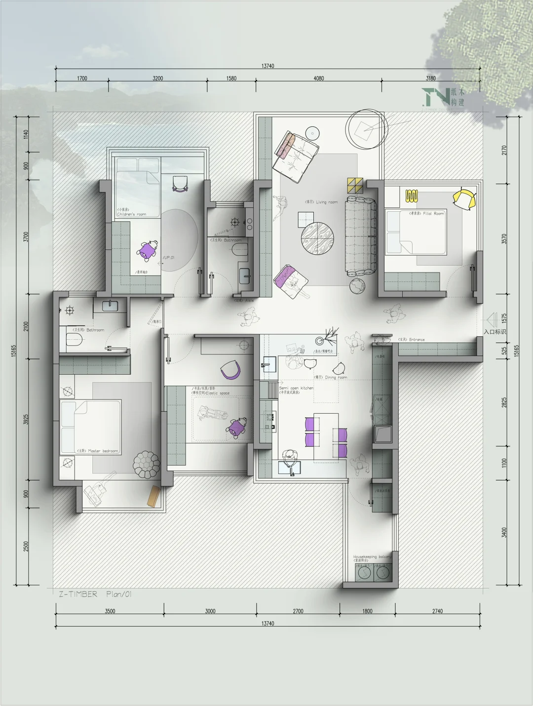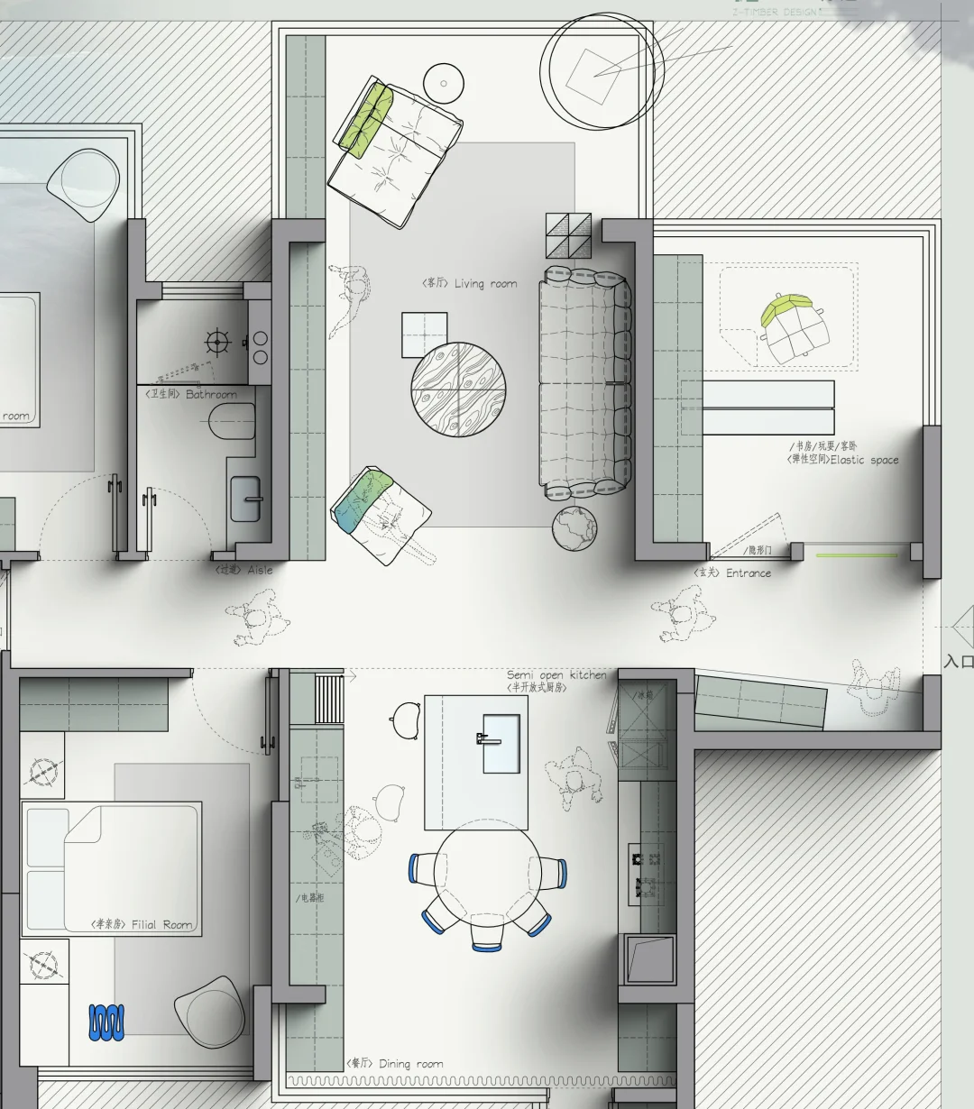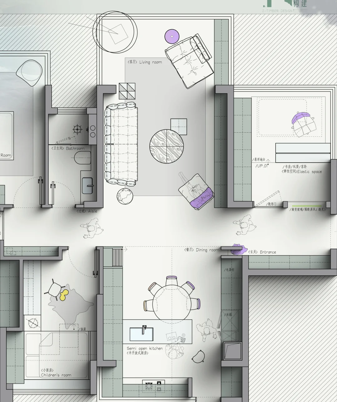 餐厅小,厨房小,1+1可以大于二吗? 设计需求: 一家四口 1、主卧、长辈房、儿童房、一个多功能书房兼客房 2、重点餐厨部分,想要开阔,看起来大 3、客厅,可以封阳台(增加一个可以晒太阳🌞的休闲区) 4、家政间