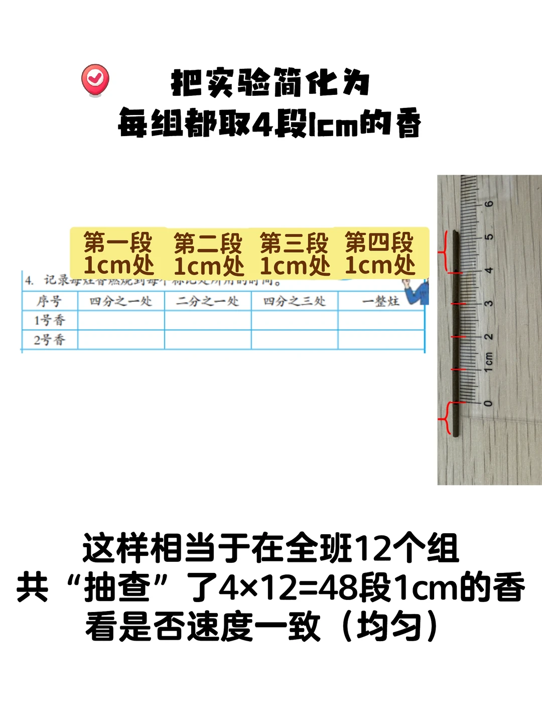 📍【每个组只燃一根香】,取【1厘米】长的四段,组内完成一根香不同位置的比较