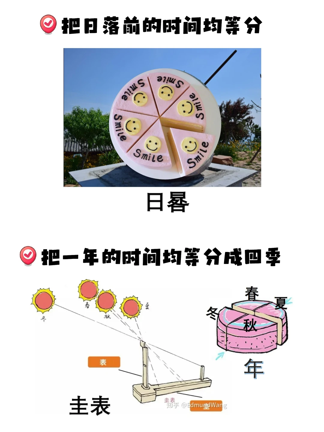 📍圭表:按照影子最长、最短、中间的规律,把一年的时间【均等】分成4块——春夏秋冬